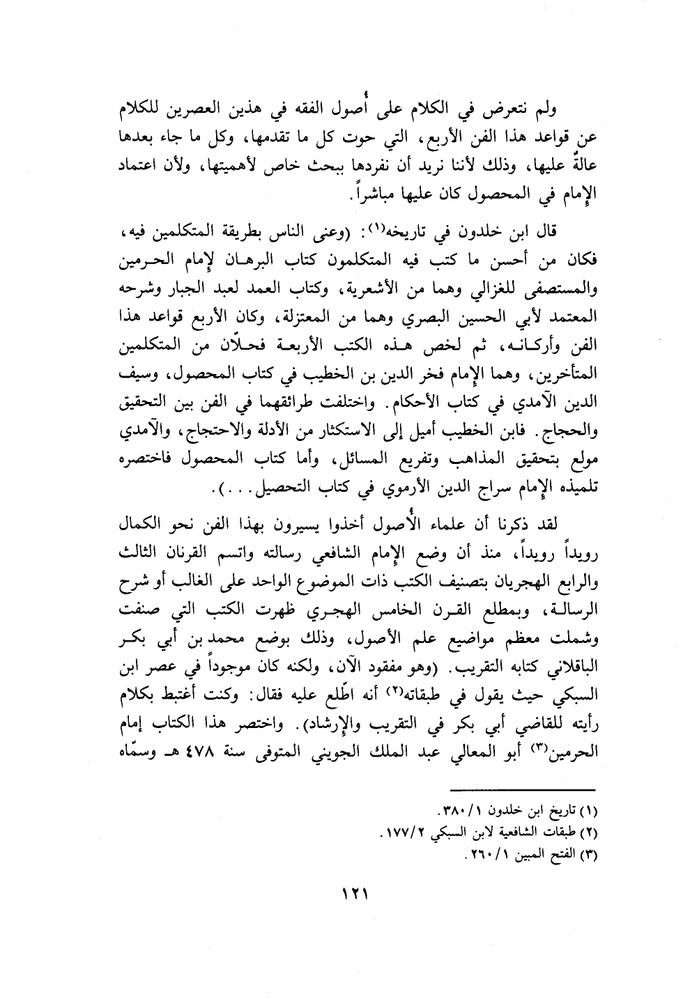قال ابن خلدون في تاريخه (١): (وعنى الناس بطريقة المتكلمين فيه، فكان من أحسن ما كتب فيه المتكلمون كتاب البرهان لإِمام الحرمين والمستصفى للغزالي وهما من الأشعرية، وكتاب العمد لعبد الجبار وشرحه المعتمد لأبي الحسين البصري وهما من المعتزلة، وكان الأربع قواعد هذا الفن وأركانه، ثم لخص هذه الكتب الأربعة فحلّان من المتكلمين المتأخرين، وهما الإِمام فخر الدين بن الخطيب في كتاب المحصول، وسيف الدين الآمدي في كتاب الأحكام. واختلفت طرائقهما في الفن بين التحقيق