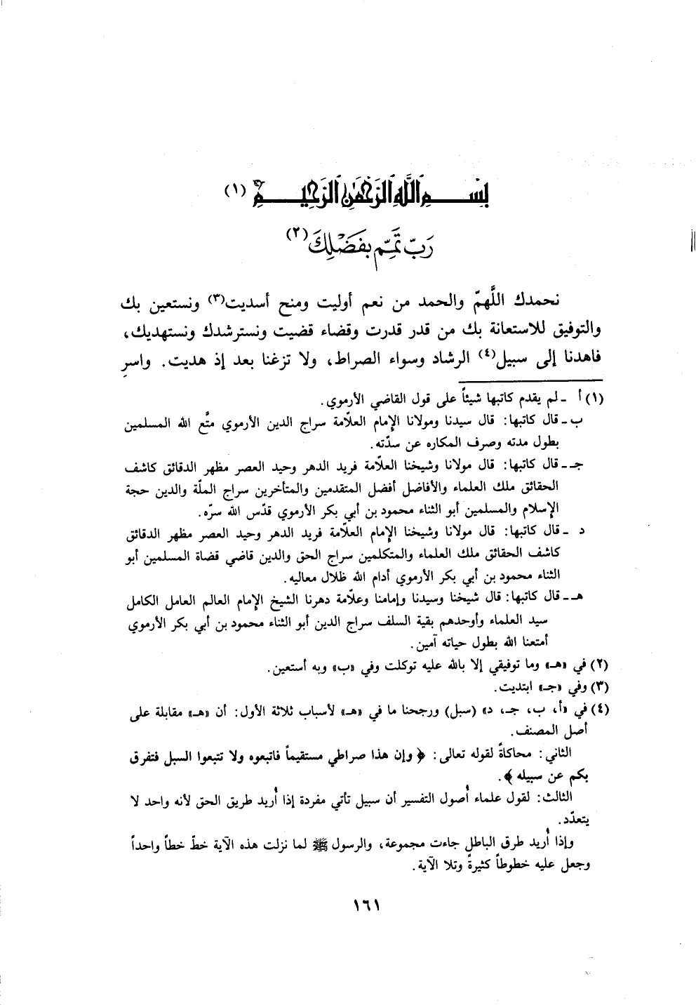 هـ- قال كاتبها: قال شيخنا وسيدنا وإمامنا وعلّامة دهرنا الشيخ الإمام العالم العامل الكامل سيد العلماء وأوحدهم بقية السلف سراج الدين أبو الثناء محمود بن أبي بكر الأرموي أمتعنا الله بطول حياته آمين.