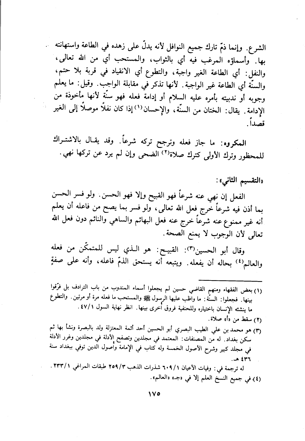 (٣) هو محمد بن علي الطيب البصري أبو الحسين أحد أئمة المعتزلة ولد بالبصرة ونشأ بها ثم سكن بغداد. له من المصنفات: المعتمد في مجلدين وتصفح الأدلة في مجلدين وغرر الأدلة في مجلد كبير وشرح الأصول الخمسة وله كتاب في الإمامة وأُصول الدين توفي ببغداد سنة ٤٣٦ هـ.