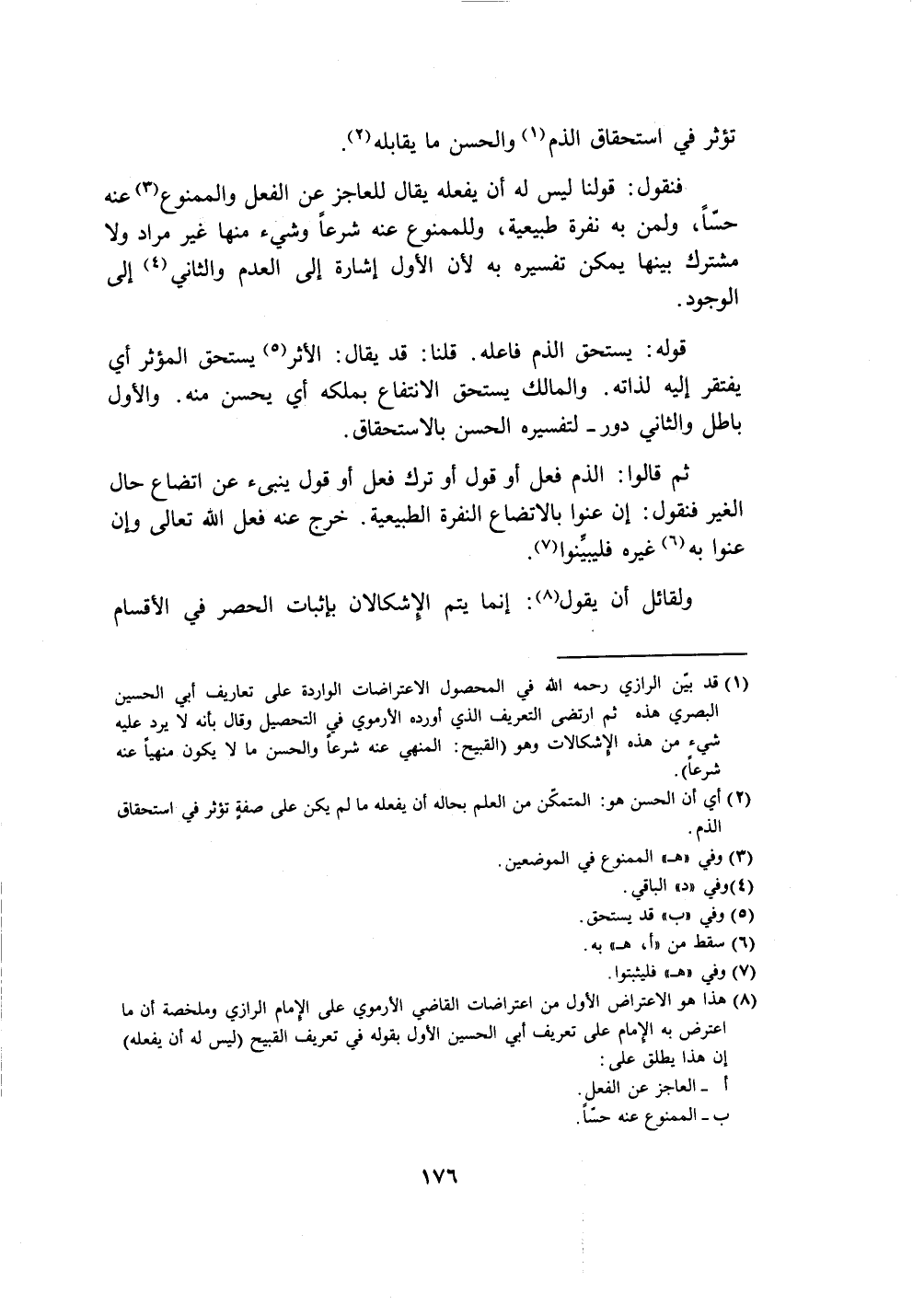 (١) قد بيّن الرازي رحمه الله في المحصول الاعتراضات الواردة على تعاريف أبي الحسين البصري هذه ثم ارتضى النعريف الذي أورده الأرموي في التحصيل وقال بأنه لا يرد عليه شيء من هذه الإشكالات وهو (القبيح: المنهي عنه شرعاً والحسن ما لا يكون منهياً عنه شرعاً).