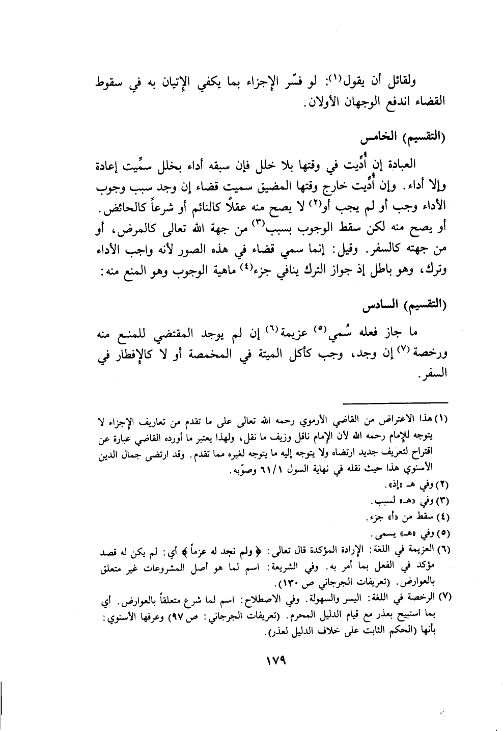 (١) هذا الاعتراض من القاضي الأرموي رحمه الله تعالى على ما تقدم من تعاريف الإجزاء لا يتوجه للإمام رحمه الله لأن الإمام ناقل وزيف ما نقل، ولهذا يعتبر ما أورده القاضي عبارة عن اقتراح لتعريف جديد ارتضاه ولا يتوجه إليه ما يتوجه لغيره مما تقدم. وقد ارتضى جمال الدين الأسنوي هذا حيث نقله في نهاية السول ١/ ٦١ وصوّبه.