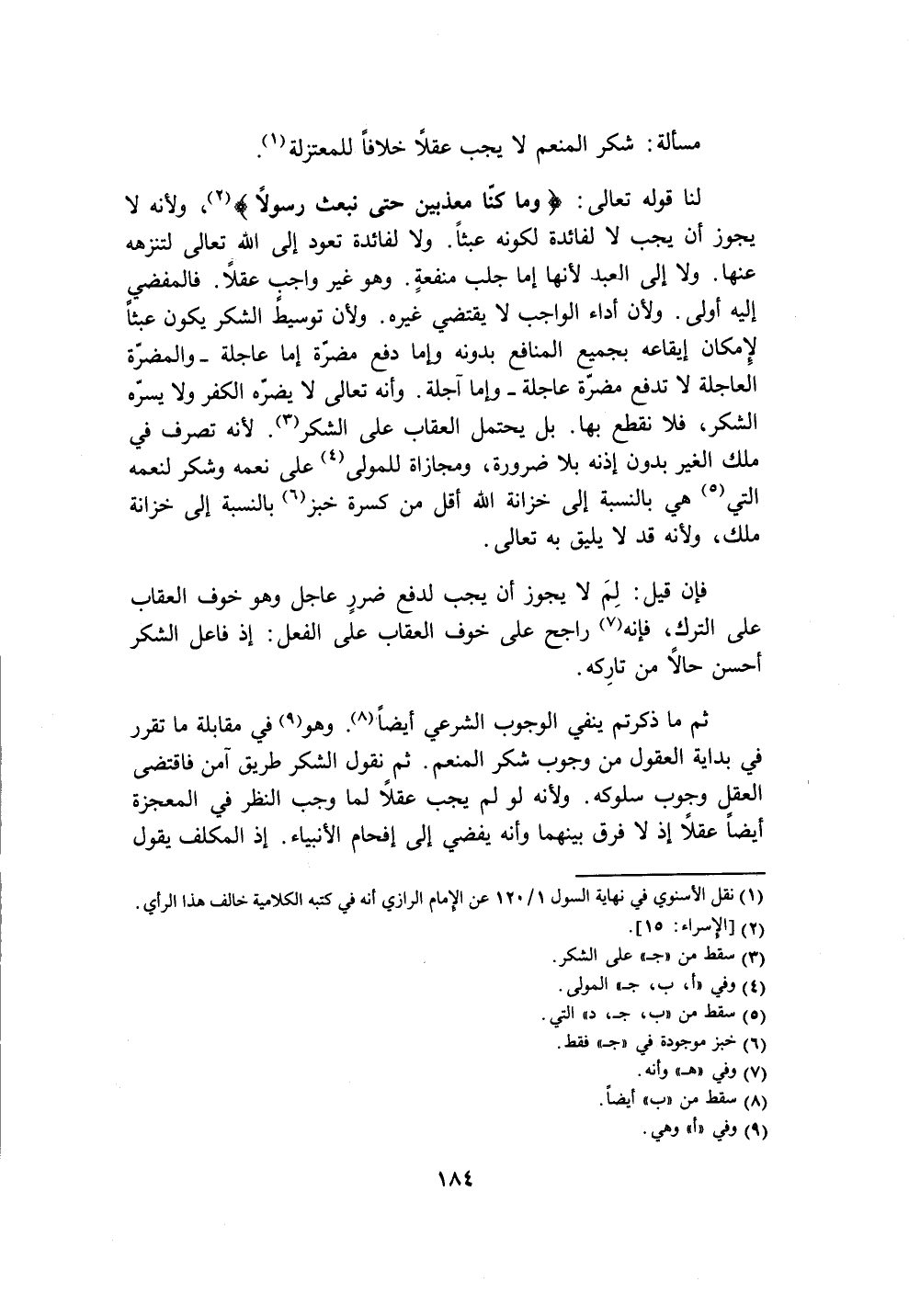مسألة: شكر المنعم لا يجب عقلاً خلافاً للمعتزلة (١).