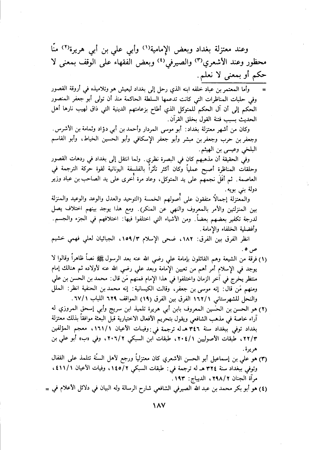 (٤) هو أبو بكر محمد بن عبد الله الصيرفي الشافعي شارح الرسالة وله البيان في دلائل الأعلام في=