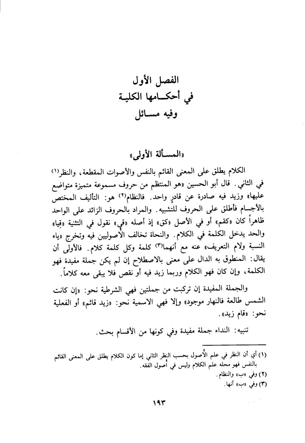 (١) أي أن النظر في علم الُاصول بحسب النظر الثاني إما كون الكلام يطلق على المعنى القائم بالنفس فهو محله علم الكلام وليس في أُصول الفقه.