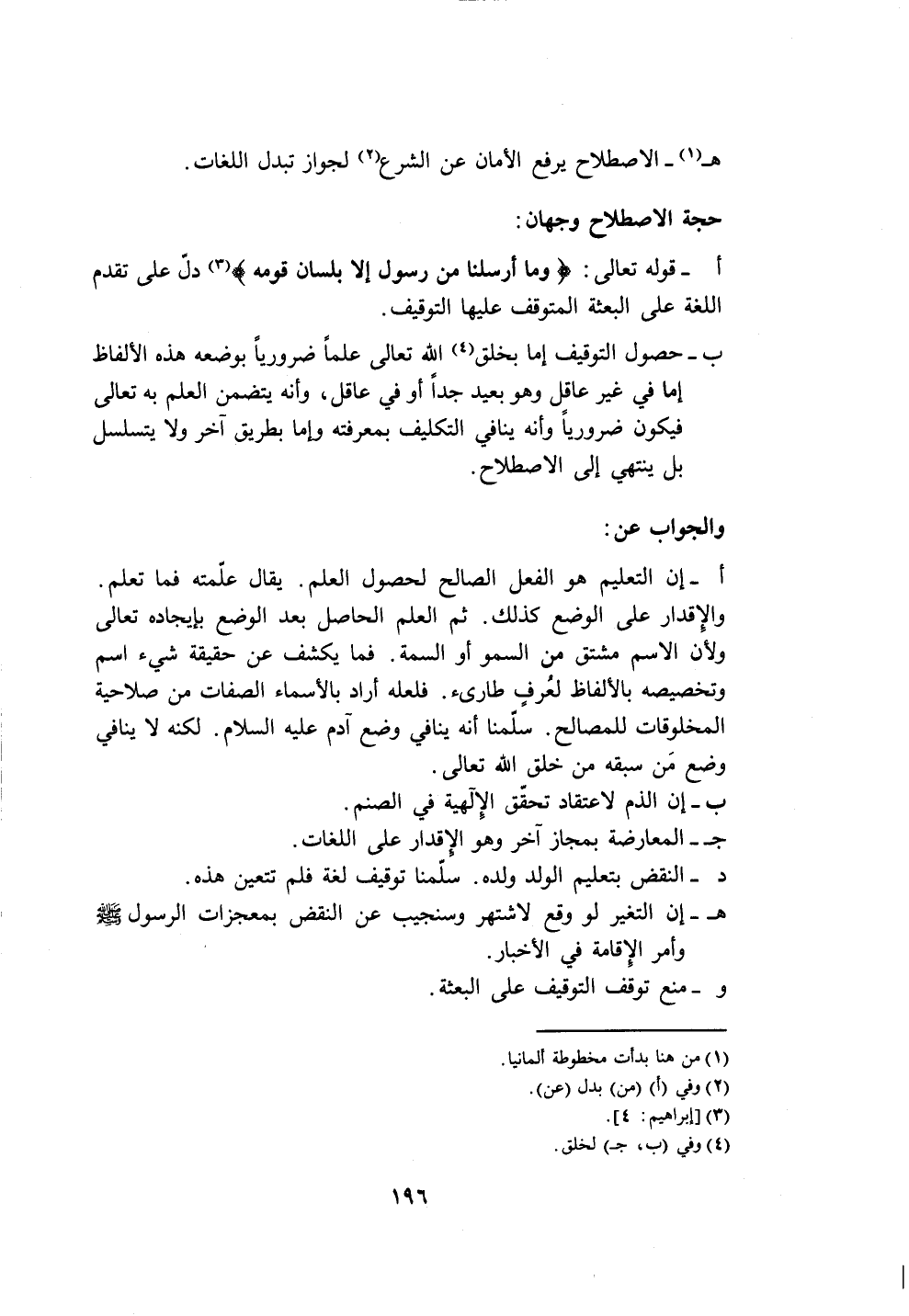 ب- حصول التوقيف إما بخلق (٤) الله تعالى علماً ضرورياً بوضعه هذه الألفاظ إما في غير عاقل وهو بعيد جداً أو في عاقل، وأنه يتضمن العلم به تعالى فيكون ضرورياً وأنه ينافي التكليف بمعرفته وإما بطريق آخر ولا يتسلسل بل ينتهي إلى الاصطلاح.