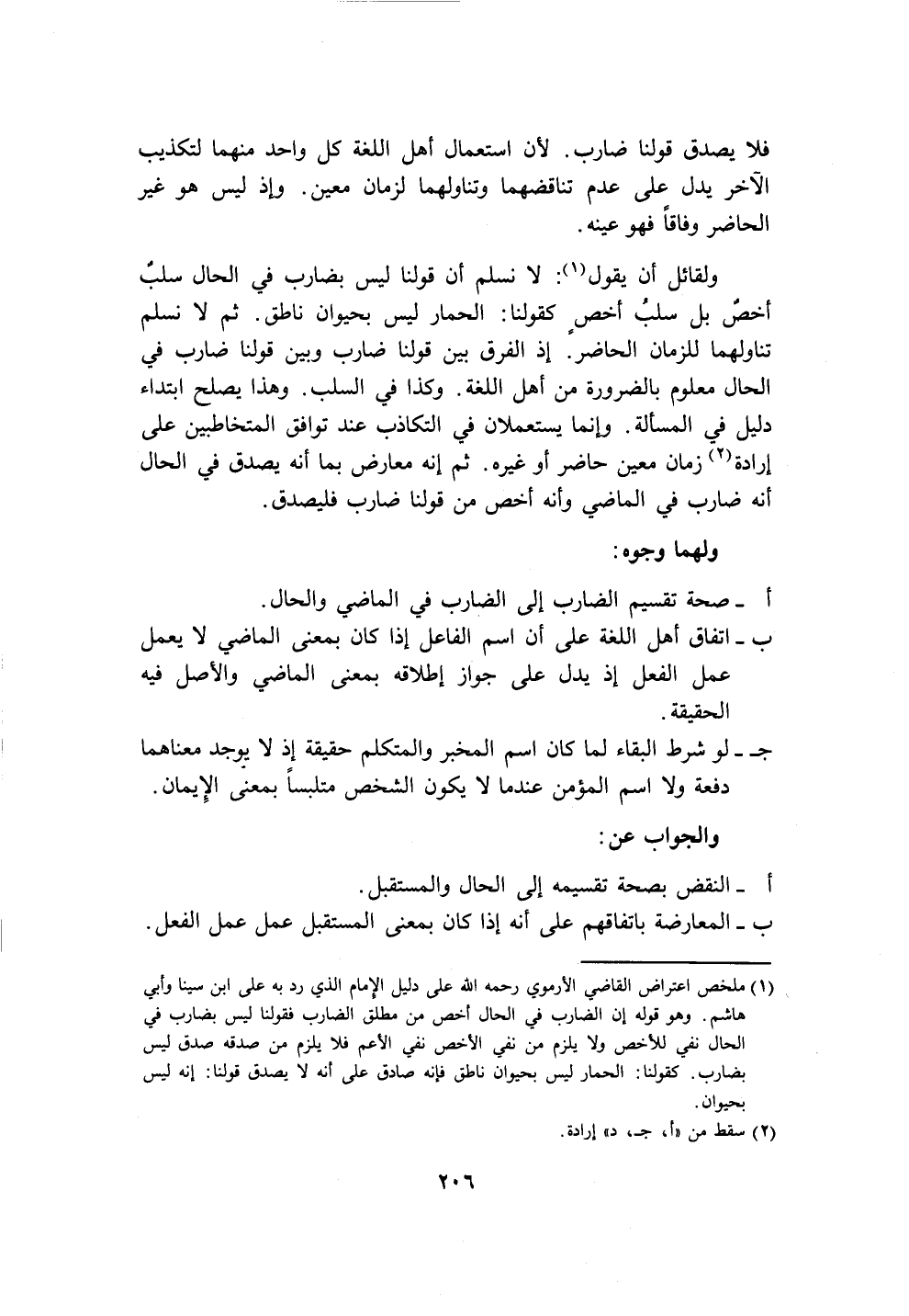 (١) ملخص اعتراض القاضي الأرموي رحمه الله على دليل الإِمام الذي رد به على ابن سينا وأبي هاشم. وهو قوله إن الضارب في الحال أخص من مطلق الضارب فقولنا ليس بضارب في الحال نفي للأخص ولا يلزم من نفي الأخص نفي الأعم فلا يلزم من صدقه صدق ليس بضارب. كقولنا: الحمار ليس بحيوان ناطق فإنه صادق على أنه لا يصدق قولنا: إنه ليس بحيوان.
