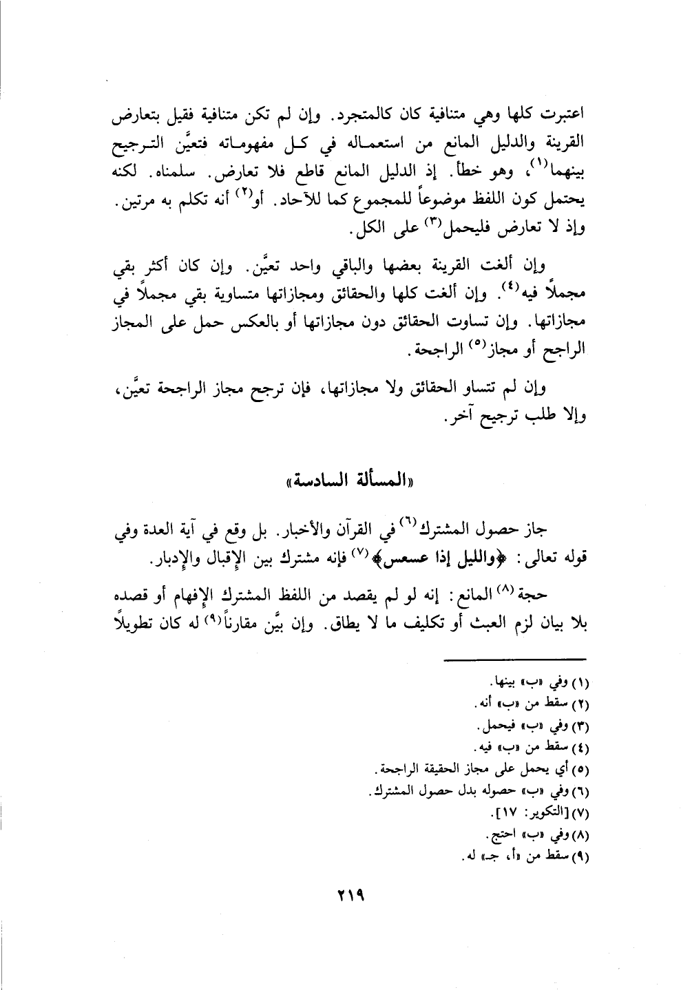 جاز حصول المشترك (٦) في القرآن والأخبار. بل وقع في آية العدة وفي قوله تعالى: {وَاللَّيْلِ إِذَا عَسْعَسَ} (٧) فإنه مشترك بين الإِقبال والإِدبار.