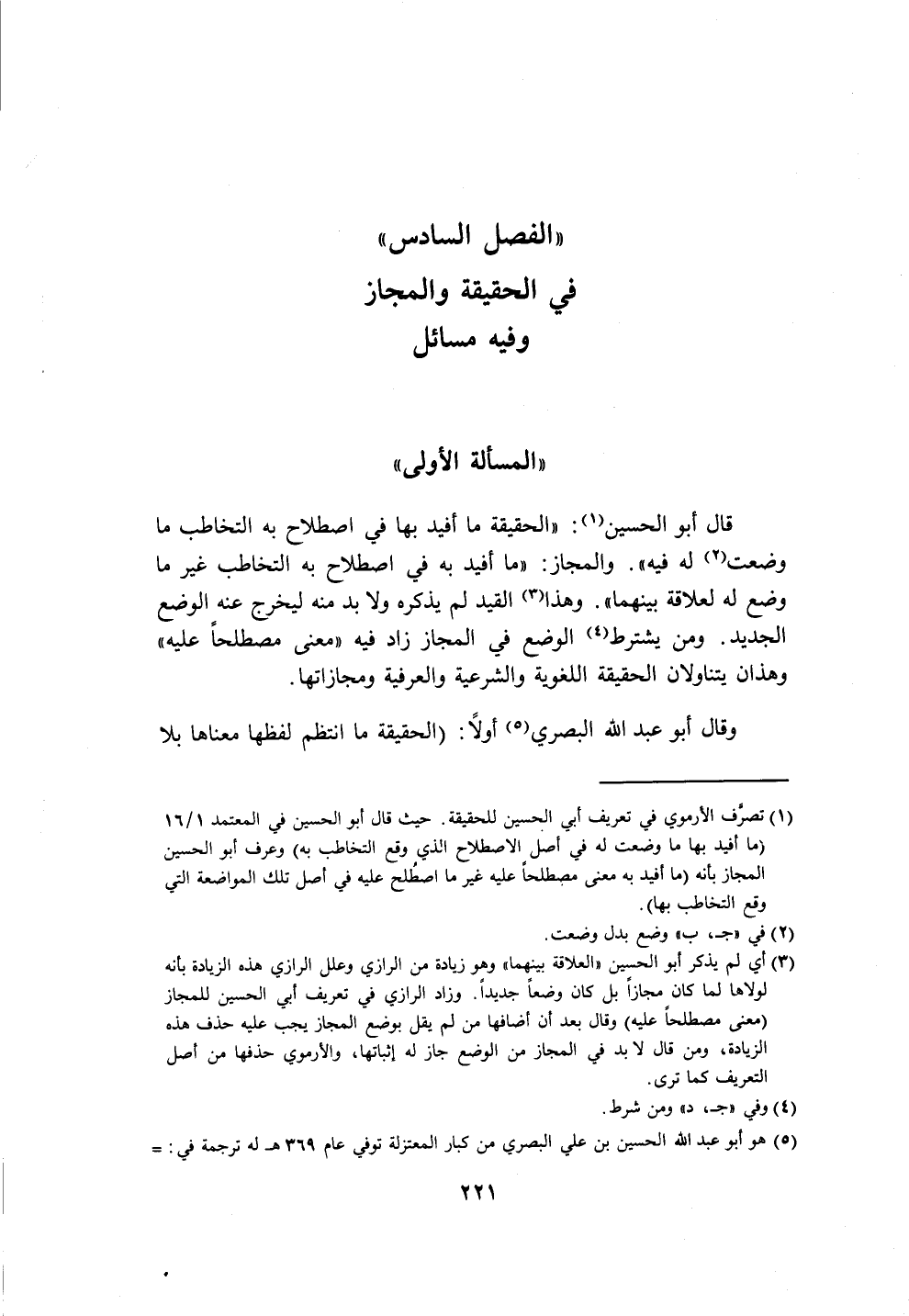 (١) تصرَّف الأرموي في تعريف أبي الحسن للحقيقة. حيث قال أبو الحسين في المعتمد ١/ ١٦ (ما أفيد بها ما وضعت له في أصل الاصطلاح الذي وقع التخاطب به) وعرف أبو الحسين المجاز بأنه (ما أفيد به معنى مصطلحًا عليه غير ما اصطُلح عليه في أصل تلك المواضعة التي وقع التخاطب بها).