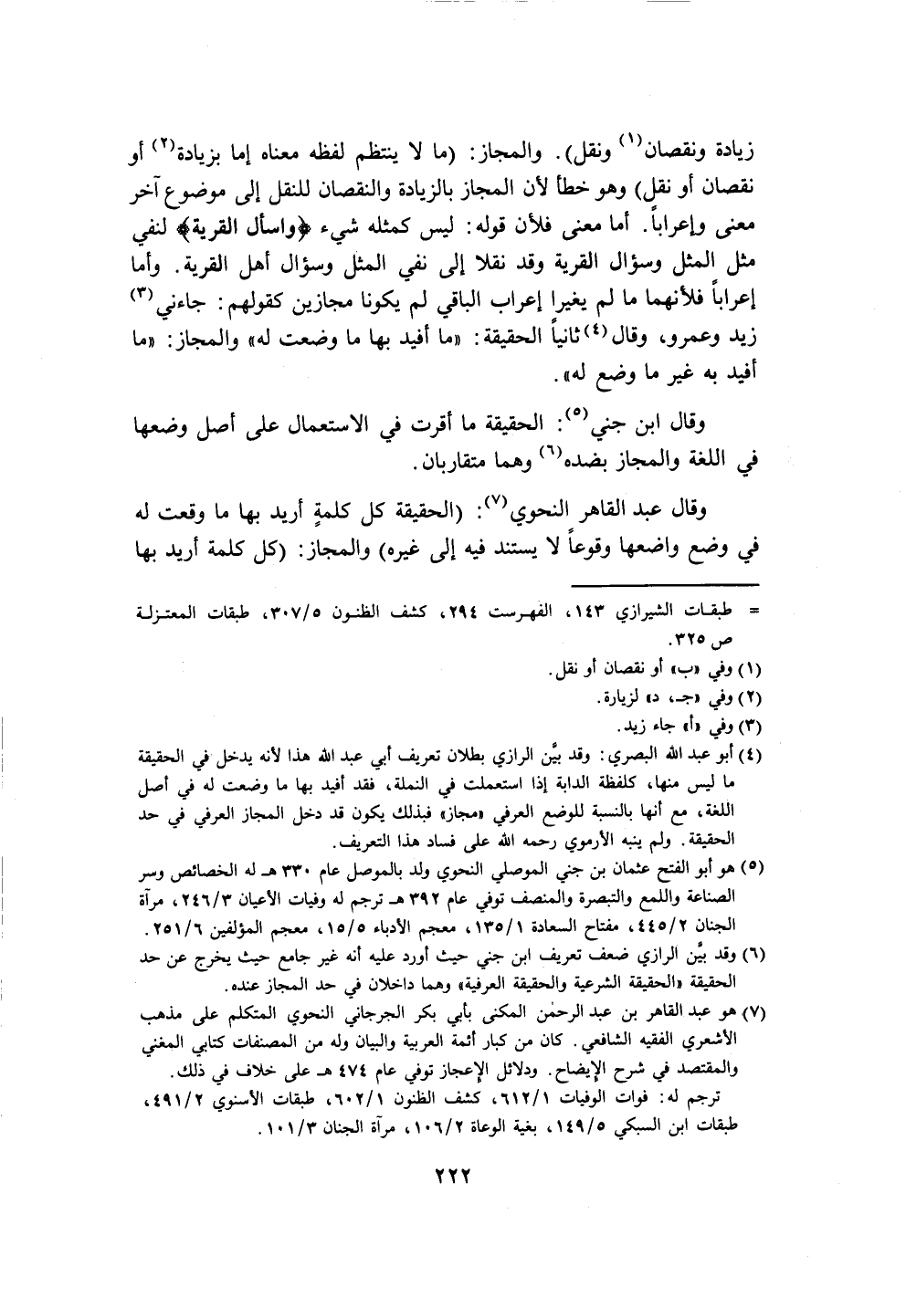 (٧) هو عبد القاهر بن عبد الرحمن المكنى بأبي بكر الجرجاني النحوي المتكلم على مذهب الأشعري الفقيه الشافعي. كان من كبار أئمة العربية والبيان وله من المصنفات كتابي المغني والمقتصد في شرح الإيضاح. ودلائل الإعجاز توفي عام ٤٧٤ هـ على خلاف في ذلك.