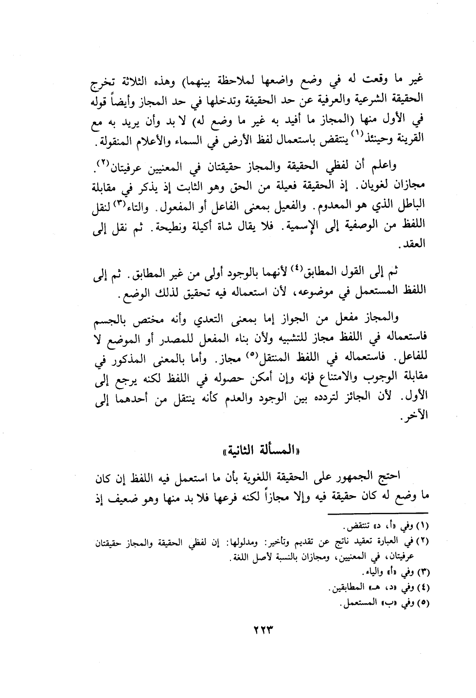 (٢) في العبارة تعقيد ناتج عن تقديم وتأخير: ومدلولها: إن لفظي الحقيقة والمجاز حقيقتان عرفيتان، في المعنيين، ومجازان بالنسبة لأصل اللغة.