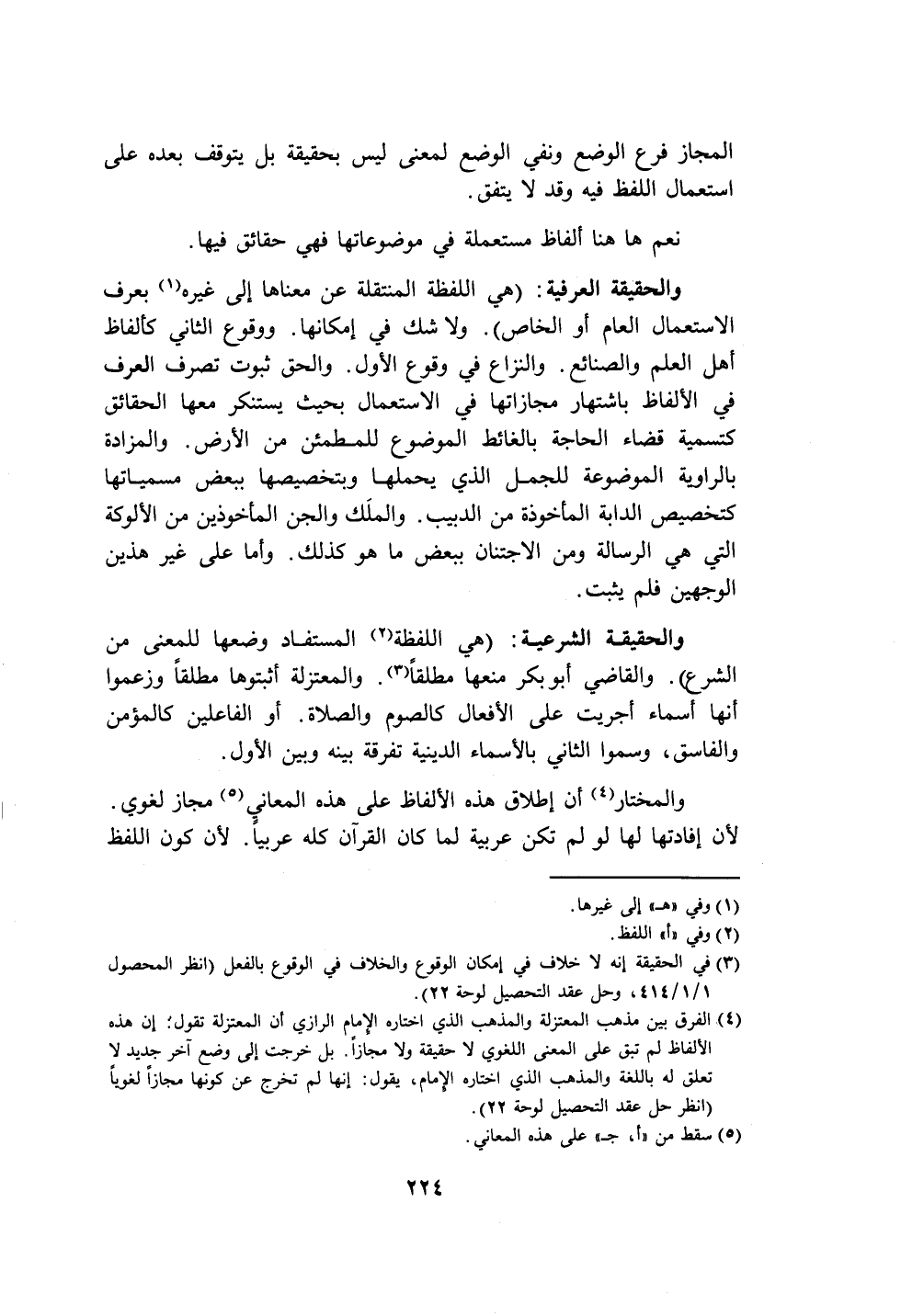 (٤) الفرق بين مذهب المعتزلة والمذهب الذي اختاره الإِمام الرازي أن المعتزلة تقول: إن هذه الألفاظ لم تبق على المعنى اللغوي لا حقيقة ولا مجازًا. بل خرجت إلى وضع آخر جديد لا تعلق له باللغة والمذهب الذي اختاره الإِمام، يقول: إنها لم تخرج عن كونها مجازًا لغوياً (انظر حل عقد التحصيل لوحة ٢٢).