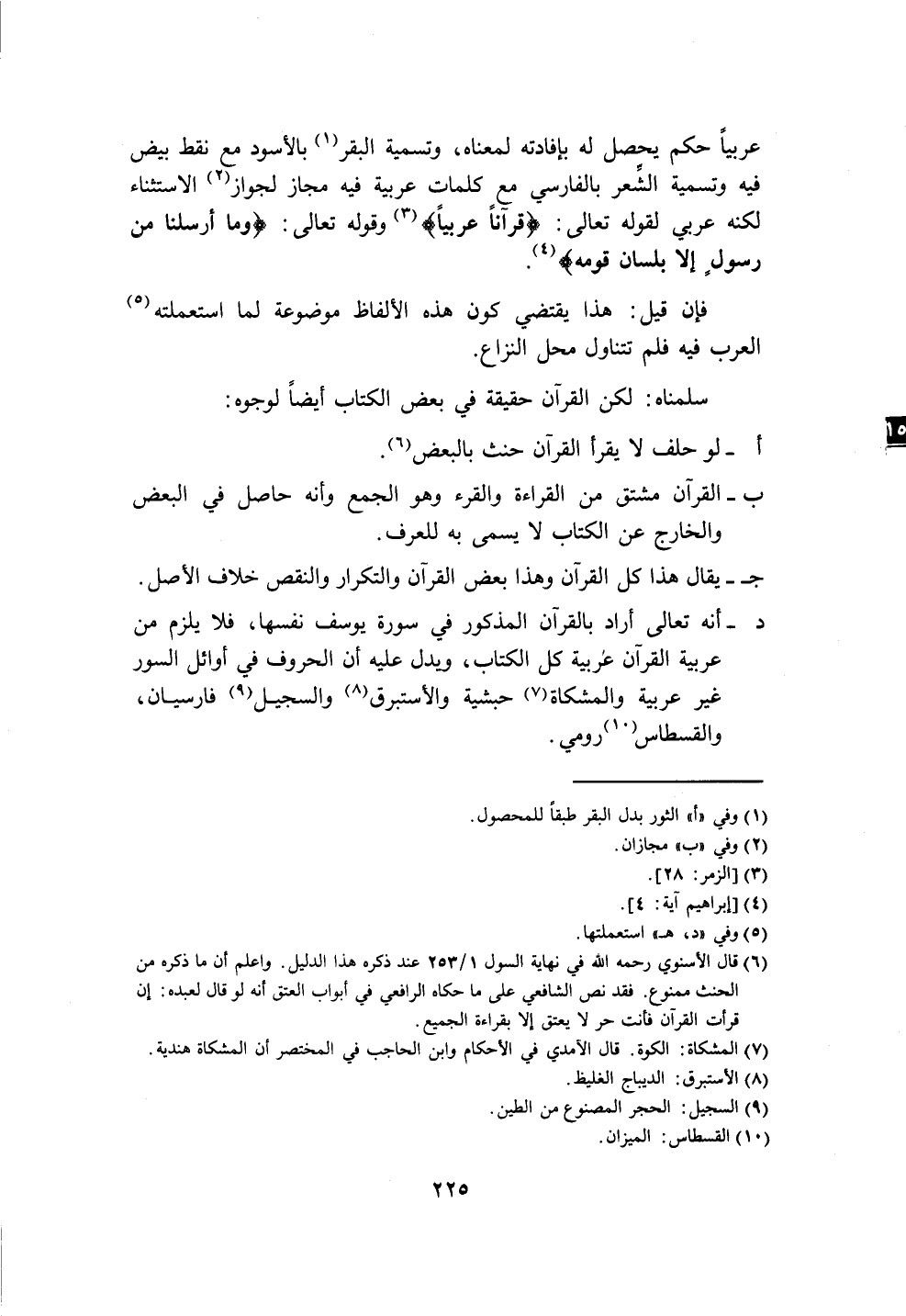 د- أنه تعالى أراد بالقرآن المذكور في سورة يوسف نفسها، فلا يلزم من عربية القرآن عربية كل الكتاب، ويدل عليه أن الحروف في أوائل السور غير عربية والمشكاة (٧) حبشية والأستبرق (٨) والسجيل (٩) فارسيان، والقسطاول (١٠) رومي.