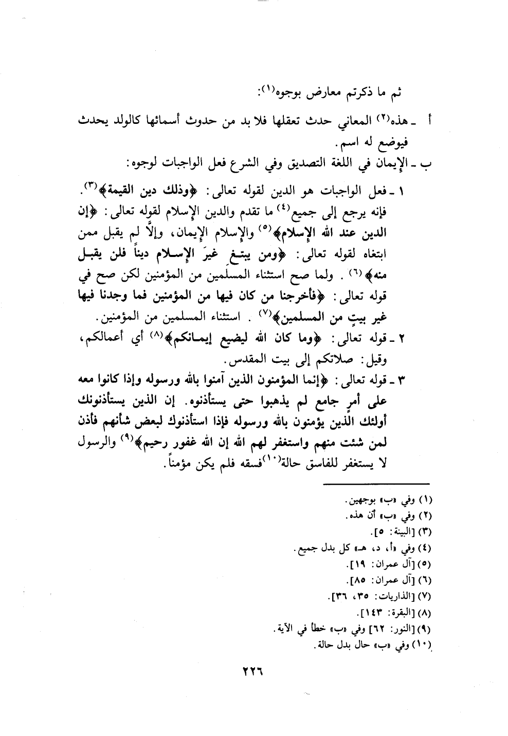 ب - الإِيمان في اللغة التصديق وفي الشرع فعل الواجبات لوجوه: