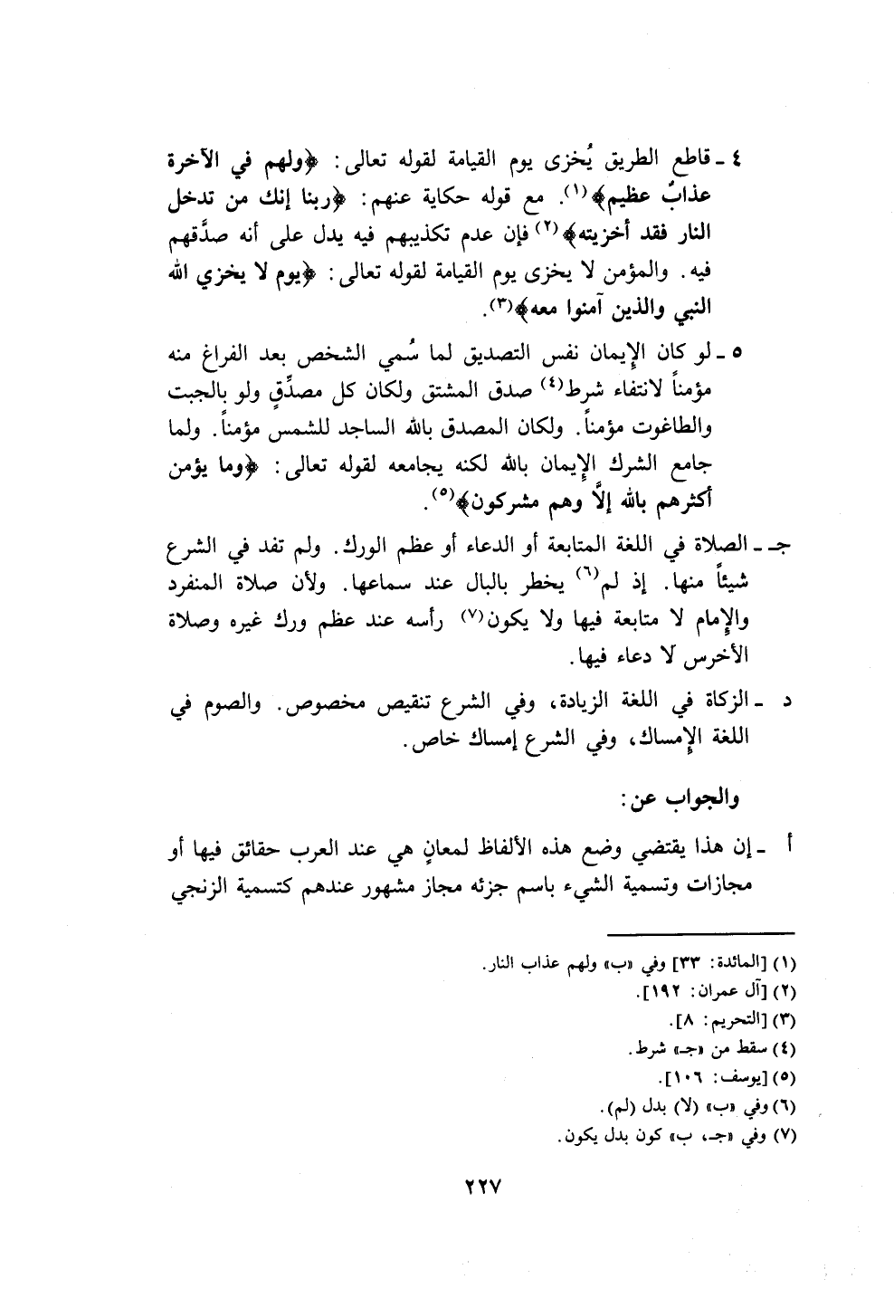 ٥ - لو كان الإِيمان نفس التصديق لما سُمي الشخص بعد الفراغ منه مؤمنًا لانتفاء شرط (٤) صدق المشتق ولكان كل مصدِّقٍ ولو بالجبت والطاغوت مؤمنًا. ولكان المصدق بالله الساجد للشمس مؤمنًا. ولما جامع الشرك الإِيمان بالله لكنه يجامعه لقوله تعالى: {وَمَا يُؤْمِنُ أَكْثَرُهُمْ بِاللَّهِ إِلَّا وَهُمْ مُشْرِكُونَ} (٥).