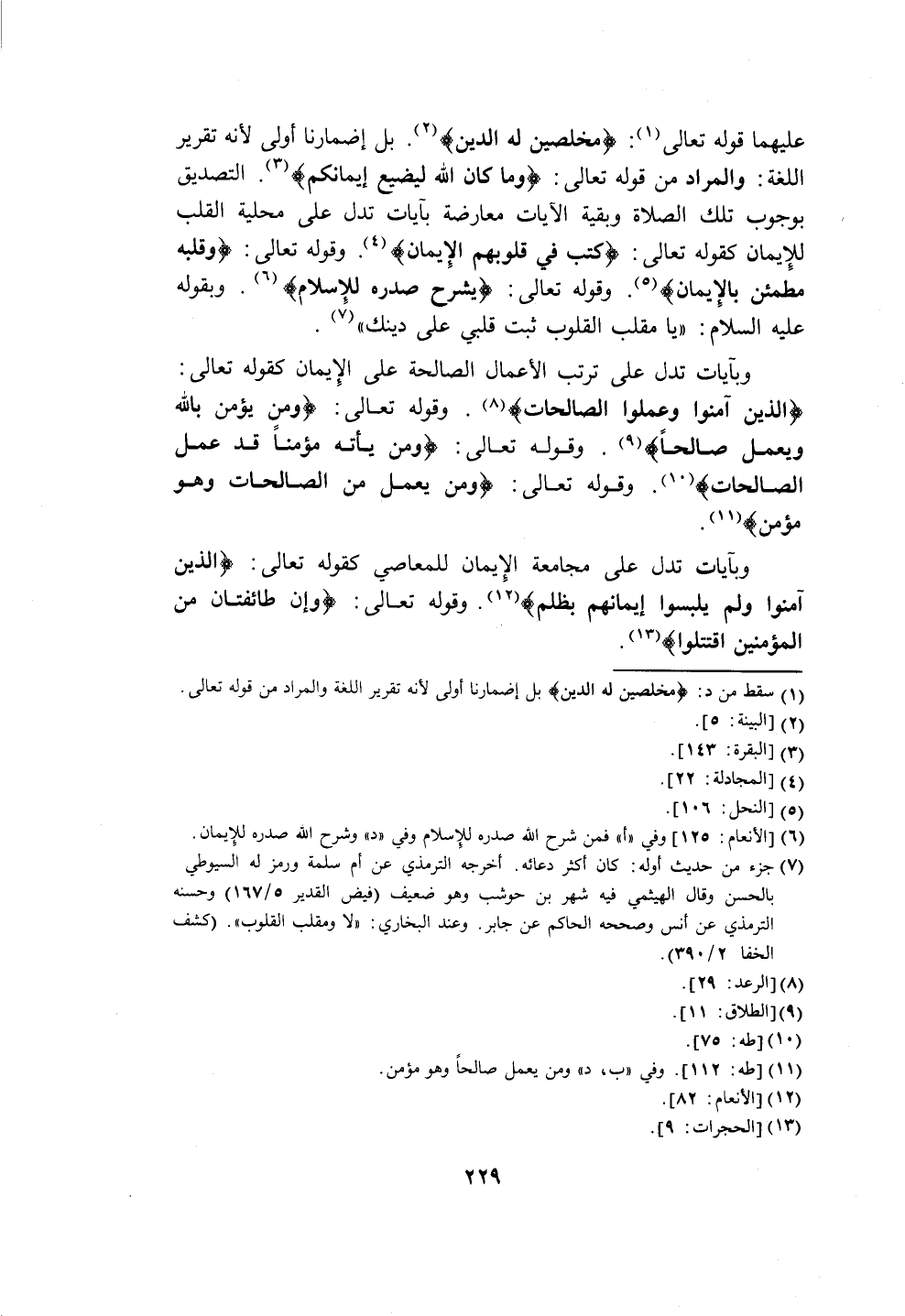 وبآيات تدل على ترتب الأعمال الصالحة على الإِيمان كقوله تعالى: {الَّذِينَ آمَنُوا وَعَمِلُوا الصَّالِحَاتِ} (٨). وقوله تعالى: {وَمَنْ يُؤْمِنْ بِاللَّهِ وَيَعْمَلْ صَالِحًا} (٩). وقوله تعالى: {وَمَنْ يَأْتِهِ مُؤْمِنًا قَدْ عَمِلَ الصَّالِحَاتِ} (١٠). وقوله تعالى: {وَمَنْ يَعْمَلْ مِنَ الصَّالِحَاتِ وَهُوَ مُؤْمِنٌ} (١١).