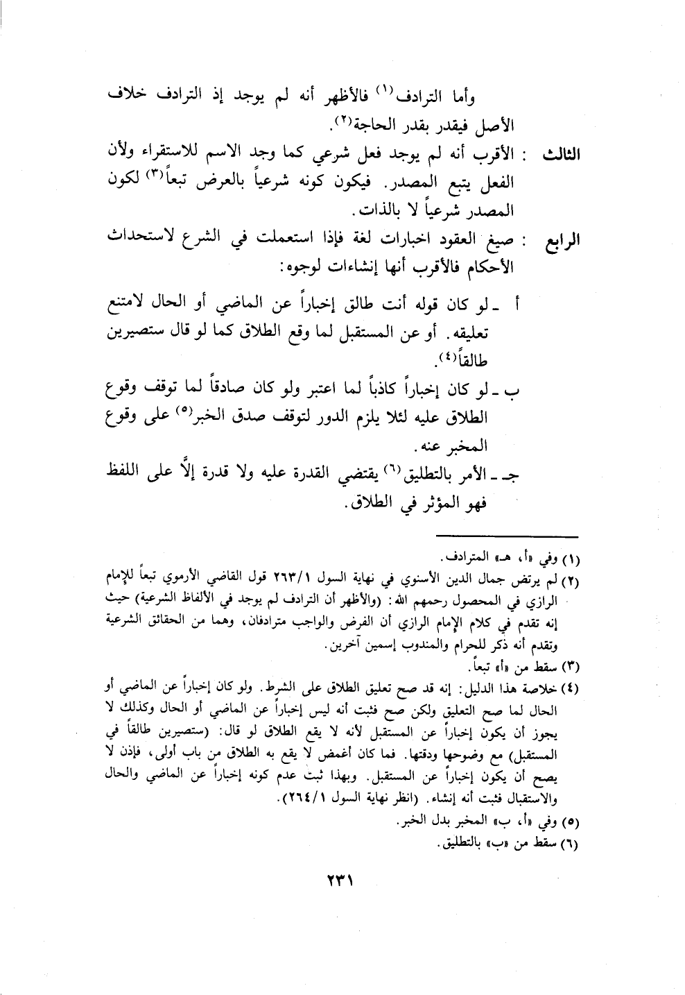 (٢) لم يرتض جمال الدين الأسنوي في نهاية السول ١/ ٢٦٣ قول القاضي الأرموي تبعًا للإمام الرازي في المحصول رحمهم الله: (والأظهر أن الترادف لم يوجد في الألفاظ الشرعية) حيث إنه تقدم في كلام الإمام الرازي أن الفرض والواجب مترادفان، وهما من الحقائق الشرعية وتقدم أنه ذكر للحرام والمندوب إسمين آخرين.