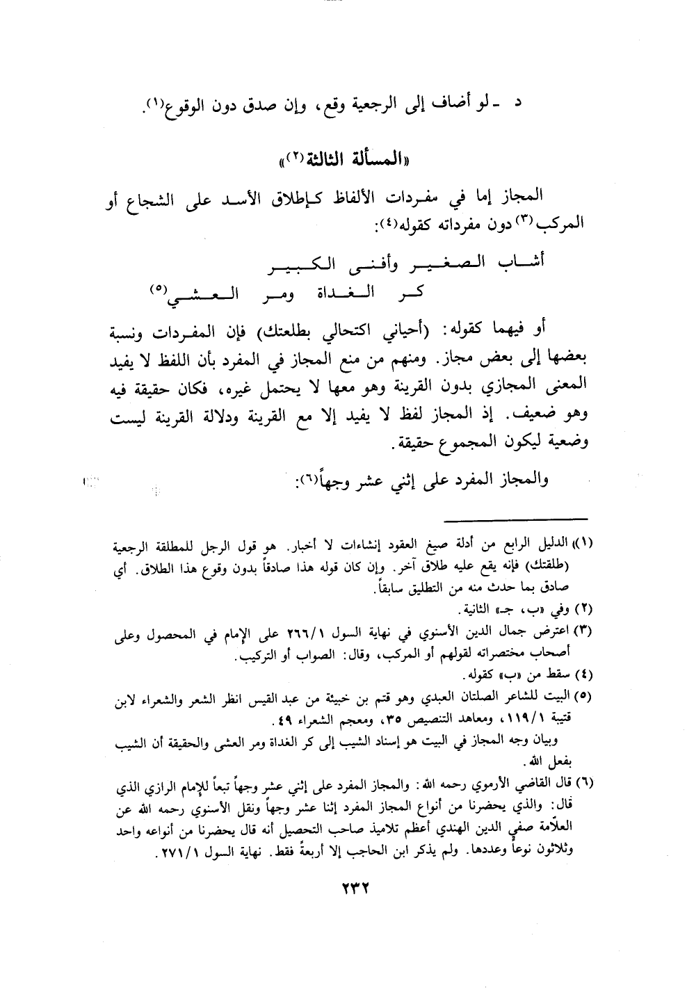 (٦) قال القاضي الأرموي رحمه الله: والمجاز المفرد على إثني عشر وجهًا تبعًا للإمام الرازي الذي قال: والذي يحضرنا من أنواع المجاز المفرد إثنا عشر وجهاً ونقل الأسنوي رحمه الله عن العلامة صفي الدين الهندي أعظم تلاميذ صاحب التحصيل أنه قال يحضرنا من أنواعه واحد وثلاثون نوعاًّ وعددها. ولم يذكر ابن الحاجب إلا أربعةً فقط. نهاية السول ١/ ٢٧١.