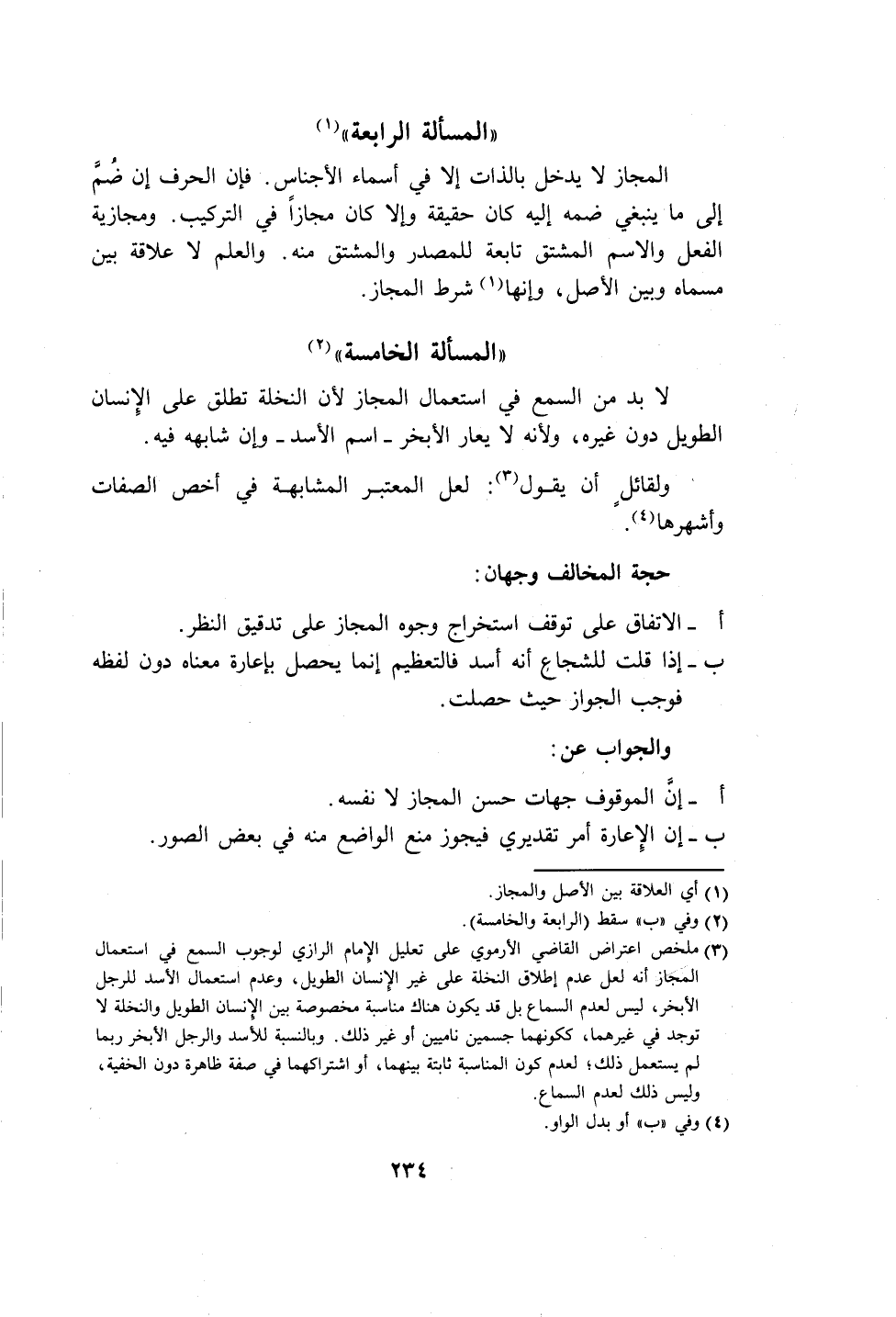 (٣) ملخص اعتراض القاضي الأرموي على تعليل الإِمام الرازي لوجوب السمع في استعمال المجاز أنه لعل عدم إطلاق النخلة على غير الإِنسان الطويل، وعدم استعمال الأسد للرجل الأبخر، ليس لعدم السماع بل قد يكون هناك مناسبة مخصوصة بين الإنسان الطويل والنخلة لا توجد في غيرهما، ككونهما جسمين ناميين أو غير ذلك. وبالنسبة للأسد والرجل الأبخر ربما لم يستعمل ذلك؛ لعدم كون المناسبة ثابتة بينهما، أو اشتراكهما في صفة ظاهرة دون الخفية، وليس ذلك لعدم السماع.