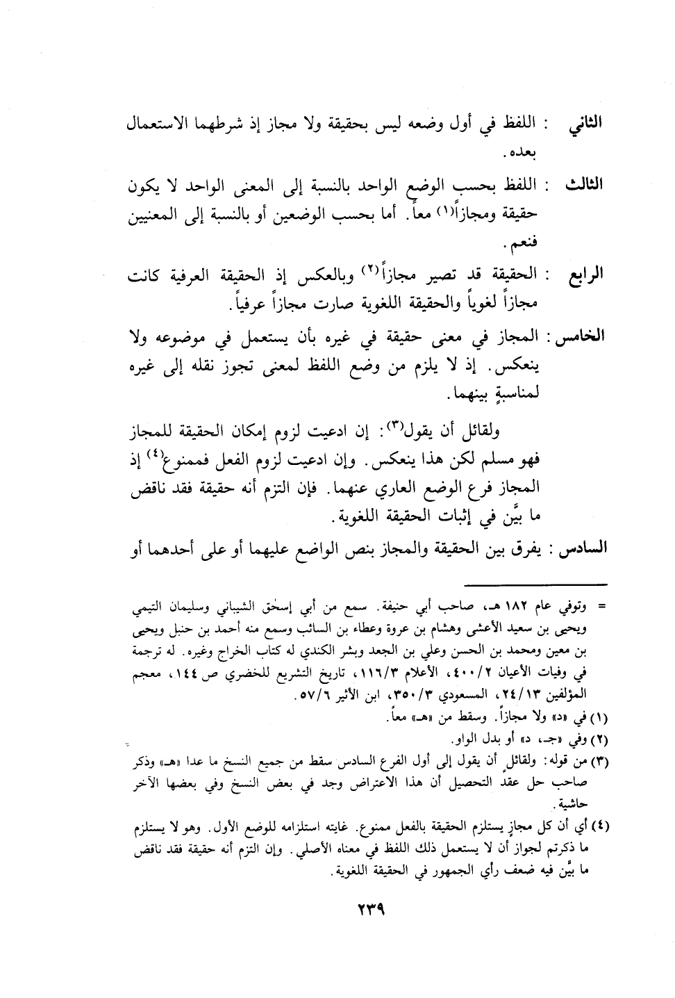 الرابع: الحقيقة قد تصير مجازًا (٢) وبالعكس إذ الحقيقة العرفية كانت مجازًا لغوياً والحقيقة اللغوية صارت مجازًا عرفيًا.