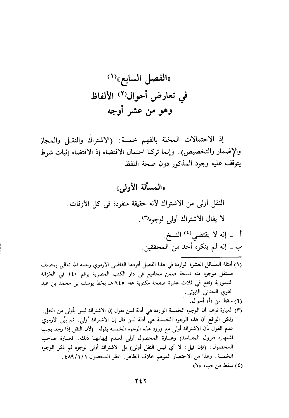 ولكن الواقع أن هذه الوجوه الخمسة هي أدلة لمن قال إن الاشتراك أولى. ثم بيَّن الأرموي عدم القول بأن الاشتراك أولى مع ورود هذه الوجوه الخمسة بقوله: (لأن النقل إذا وجد يجب اشتهاره فتزول المفاسد) وعبارة المحصول أولى لعدم إيهامها ذلك. فعبارة صاحب المحصول: (فإن قيل: لا أي ليس النقل أولى) بل الاشتراك أولى لوجوه ثم ذكر الوجوه الخمسة. وهذا من الاختصار الموهم خلاف الظاهر. انظر المحصول ١/ ١/٤٨٩.
