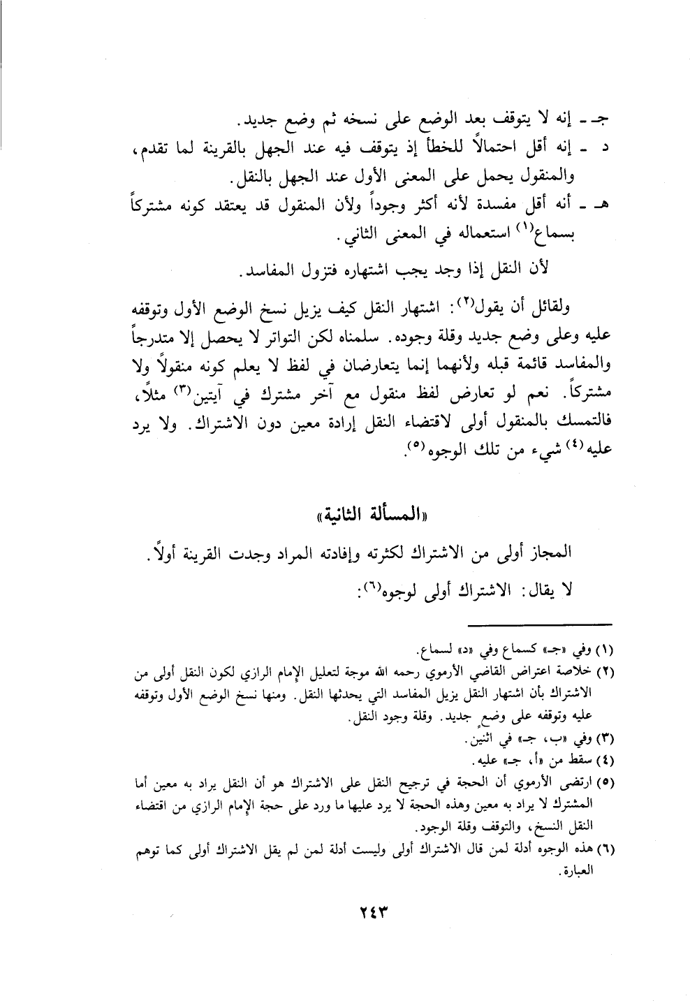 (٥) ارتضى الأرموي أن الحجة في ترجيح النقل على الاشتراك هو أن النقل يراد به معين أما المشترك لا يراد به معين وهذه الحجة لا يرد عليها ما ورد على حجة الإِمام الرازي من اقتضاء النقل النسخ، والتوقف وقلة الوجود.