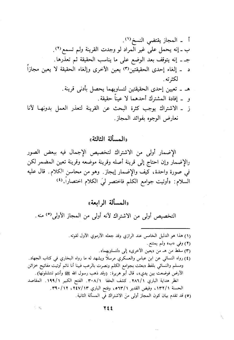 د- إلغاء إحدى الحقيقتين (٣) يعين الأخرى وإلغاء الحقيقة لا يعين مجازًا لكثرته.