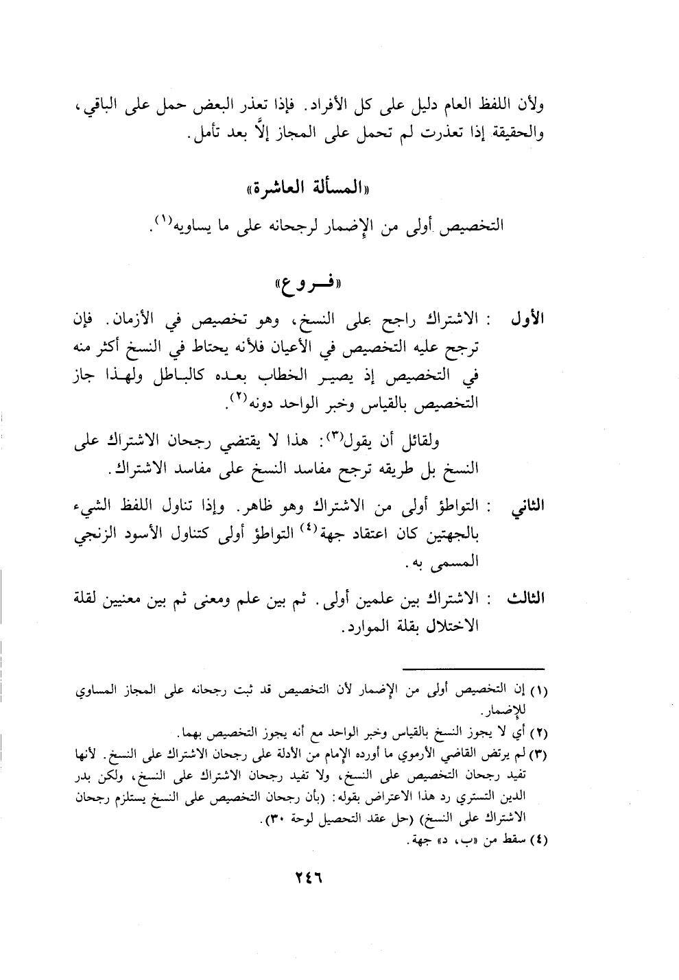 الأول: الاشتراك راجح على النسخ، وهو تخصيص في الأزمان. فإن ترجح عليه التخصيص في الأعيان فلأنه يحتاط في النسخ أكثر منه في التخصيص إذ يصير الخطاب بعده كالباطل ولهذا جاز