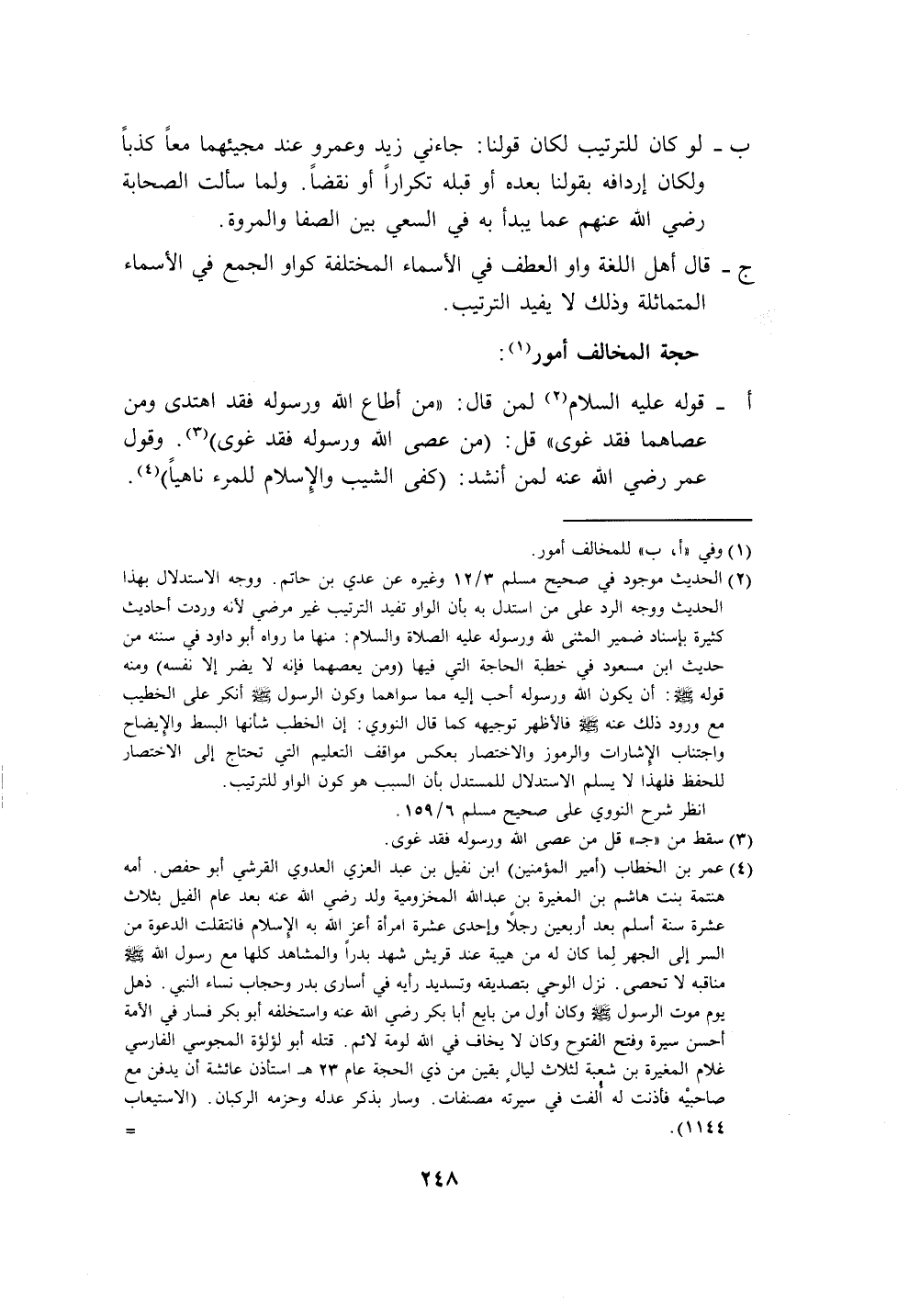 (٢) الحديث موجود في صحيح مسلم ٣/ ١٢ وغيره عن عدي بن حاتم. ووجه الاستدلال بهذا الحديث ووجه الرد على من استدل به بأن الواو تفيد الترتيب غير مرضي لأنه وردت أحاديث كثيرة بإسناد ضمير المثنى لله ورسوله عليه الصلاة والسلام: منها ما رواه أبو داود في سننه من حديث ابن مسعود في خطبة الحاجة التي فيها (ومن يعصهما فإنه لا يضر إلا نفسه) ومنه قوله - صلى الله عليه وسلم -: أن يكون الله ورسوله أحب إليه مما سواهما وكون الرسول - صلى الله عليه وسلم - أنكر على الخطيب مع ورود ذلك عنه -صلى الله عليه وسلم- فالأظهر توجيهه كما قال النووي: إن الخطب شأنها البسط والإِيضاح واجتناب الإِشارات والرموز والاختصار بعكس مواقف التعليم التي تحتاج إلى الاختصار للحفظ فلهذا لا يسلم الاستدلال للمستدل بأن السبب هو كون الواو للترتيب.