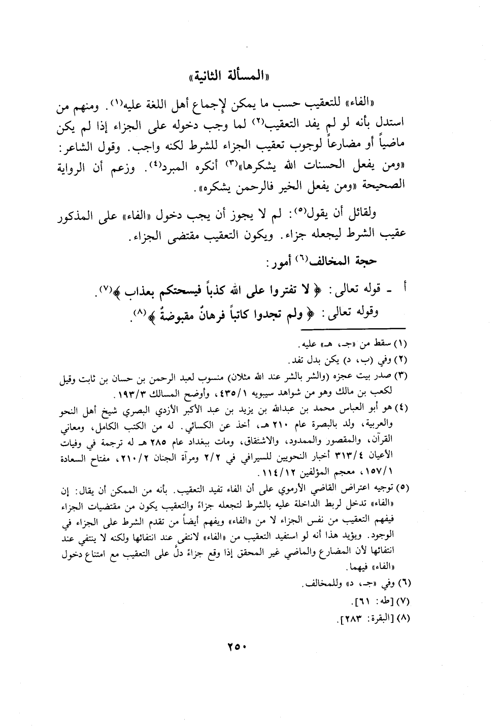 (٥) توجيه اعتراض القاضي الأرموي على أن الفاء تفيد التعقيب. بأنه من الممكن أن يقال: إن "الفاء" تدخل لربط الداخلة عليه بالشرط لتجعله جزاءً والتعقيب يكون من مقتضيات الجزاء فيفهم التعقيب من نفس الجزاء لا من "الفاء" ويفهم أيضًا من تقدم الشرط على الجزاء في الوجود. ويؤيد هذا أنه لو استفيد التعقيب من "الفاء" لانتفى عند انتفائها ولكنه لا ينتفي عند انتفائها لأن المضارع والماضي غير المحقق إذا وقع جزاءً دلَّ على التعقيب مع امتناع دخول "الفاء" فيهما.