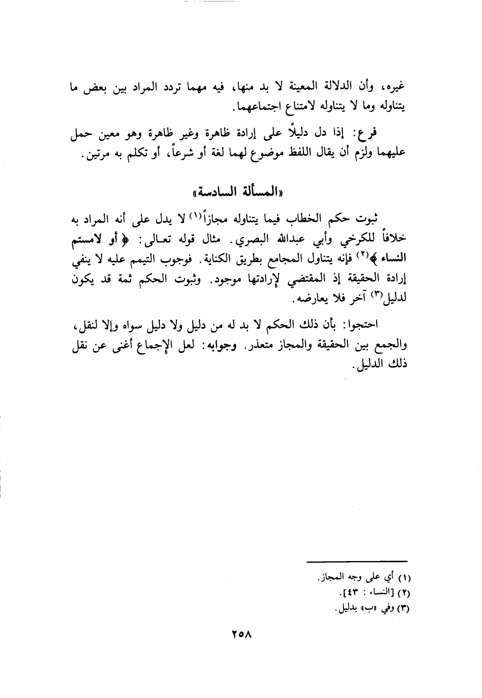 ثبوت حكم الخطاب فيما يتناوله مجازًا (١) لا يدل على أنَّه المراد به خلافًا للكرخي وأبي عبد الله البَصْرِيّ. مثال قوله تعالى: {أَوْ لَامَسْتُمُ النِّسَاءَ} (٢) فإنَّه يتناول المجامع بطريق الكناية. فوجوب التيمم عليه لا ينفي إرادة الحقيقة إذ المقتضي لإِرادتها موجود. وثبوت الحكم ثمة قد يكون لدليل (٣) آخر فلا يعارضه.