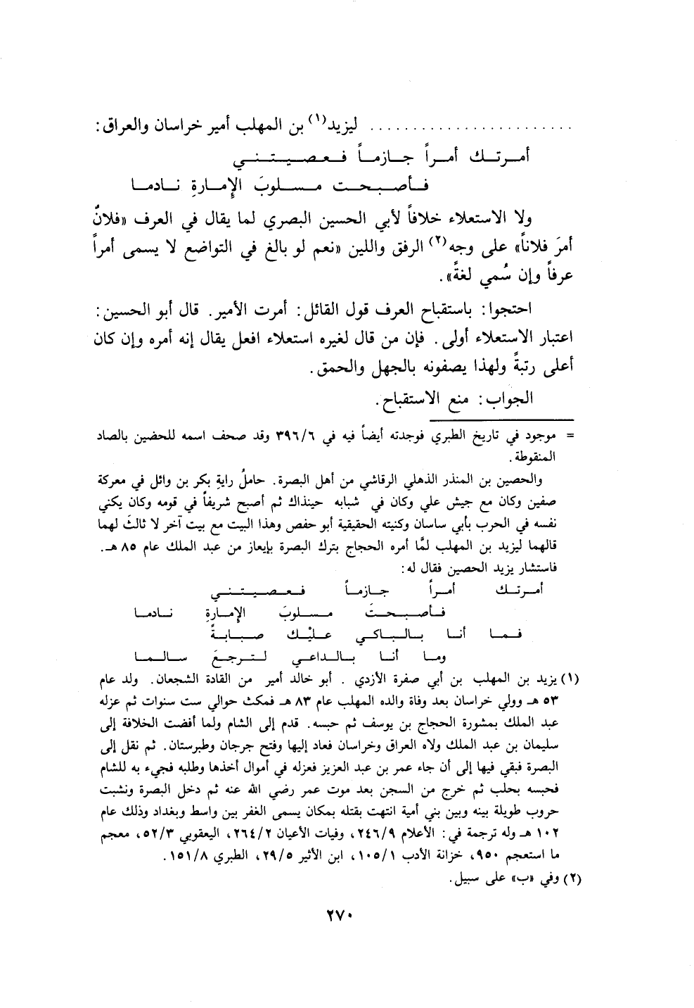 (١) يزيد بن المهلب بن أبي صفرة الأَزدِيّ. أبو خالد أمير من القادة الشجعان. ولد عام ٥٣ هـ وولي خراسان بعد وفاة والده المهلب عام ٨٣ هـ فمكث حوالي ست سنوات ثم عزله عبد الملك بمشورة الحجاج بن يوسف ثم حبسه. قدم إلى الشام ولما أفضت الخلافة إلى سليمان بن عبد الملك ولاه العراق وخراسان فعاد إليها وفتح جرجان وطبرستان. ثم نقل إلى البصرة فبقي فيها إلى أن جاء عمر بن عبد العزيز فعزله في أموال أخذها وطلبه فجيء به للشام فحبسه بحلب ثم خرج من السجن بعد موت عمر رضي الله عنه ثم دخل البصرة وثبت حروب طويلة بينه وبين بني أمية انتهت بقتله بمكان يسمى الغفر بين واسط وبغداد وذلك عام ١٠٢ هـ وله ترجمة في: الأعلام ٩/ ٢٤٦، وفيات الأعيان ٢/ ٢٦٤، اليعقوبي ٣/ ٥٢، معجم ما استعجم ٩٥٠، خزانة الأدب ١/ ١٠٥، ابن الأثير ٥/ ٢٩، الطبري ٨/ ١٥١.
