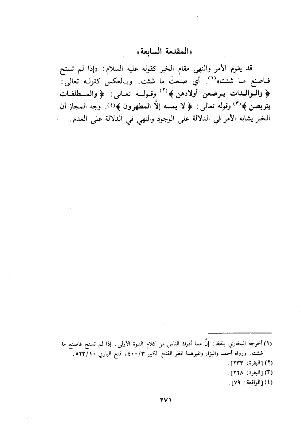 يَتَرَبَّصْنَ} (٣) وقوله تعالى: {لَا يَمَسُّهُ إِلَّا الْمُطَهَّرُونَ} (٤). وجه المجاز أن الخبر يشابه الأمر في الدلالة على الوجود والنهي في الدلالة على العدم.