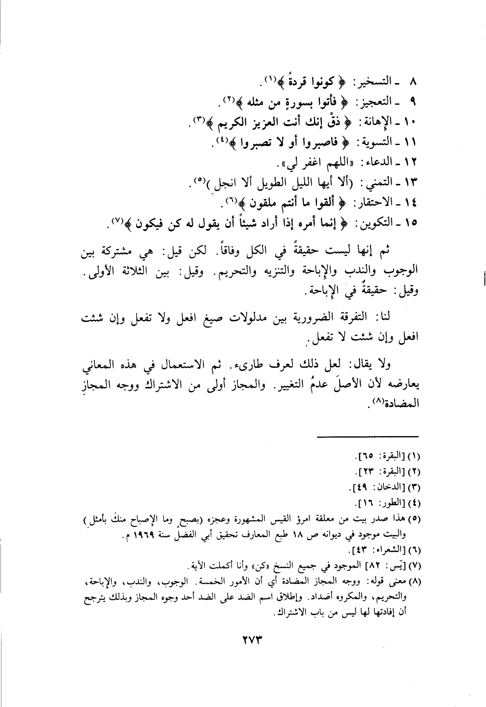 (٨) معنى قوله: ووجه المجاز المضادة أي أن الأمور الخمسة. الوجوب، والندب، والإباحة، والتحريم، والمكروه أضداد. وإطلاق اسم الضد على الضد أحد وجوه المجاز وبذلك يترجح أن إفادتها لها ليس من باب الاشتراك.