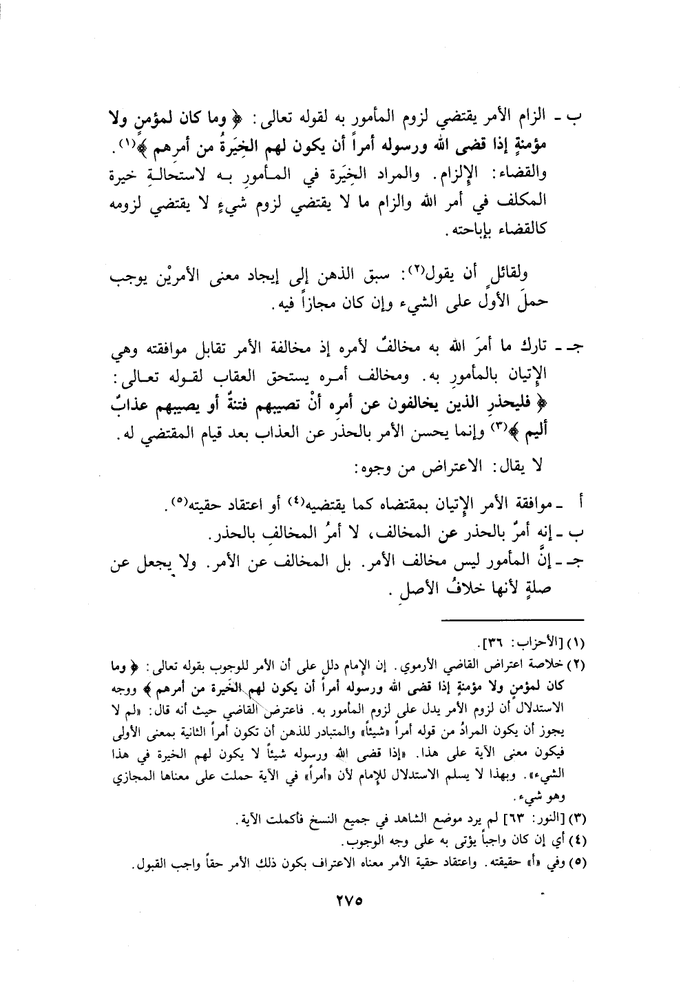 (٢) خلاصة اعتراض القاضي الأرموي. إن الإمام دلل على أن الأمر للوجوب بقوله تعالى: {وَمَا