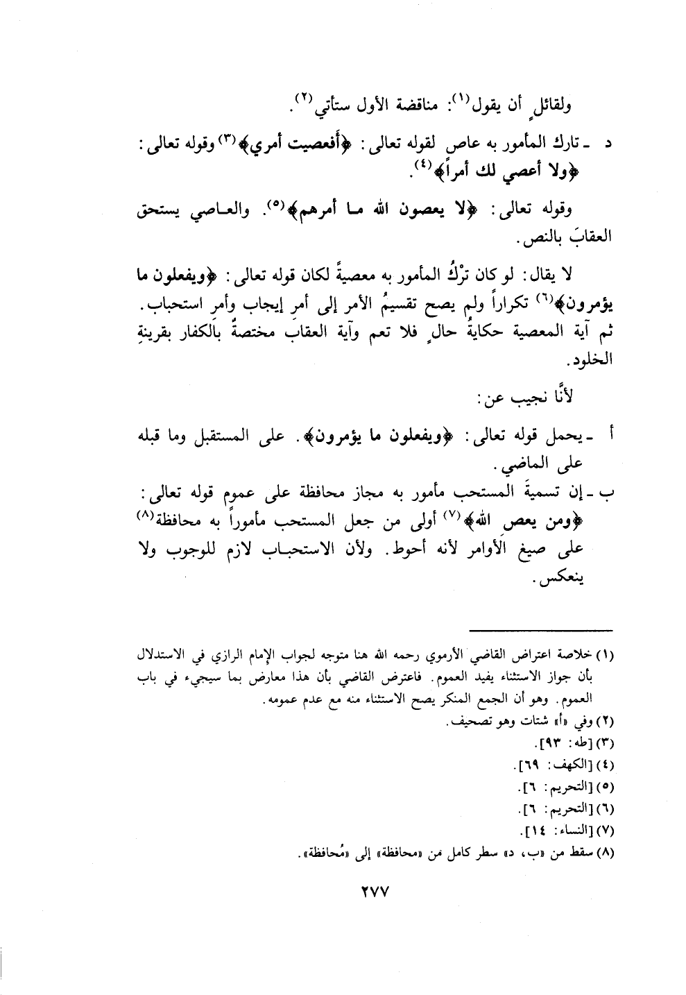 ب- إن تسميةَ المستحب مأمور به مجاز محافظة على عموِم قوله تعالى: {وَمَنْ يَعْصِ اللَّهَ} (٧) أولى من جعل المستحب مأمورًا به محافظة (٨) على صيغ الأوامر لأنه أحوط. ولأن الاستحباب لازم للوجوب ولا ينعكس.