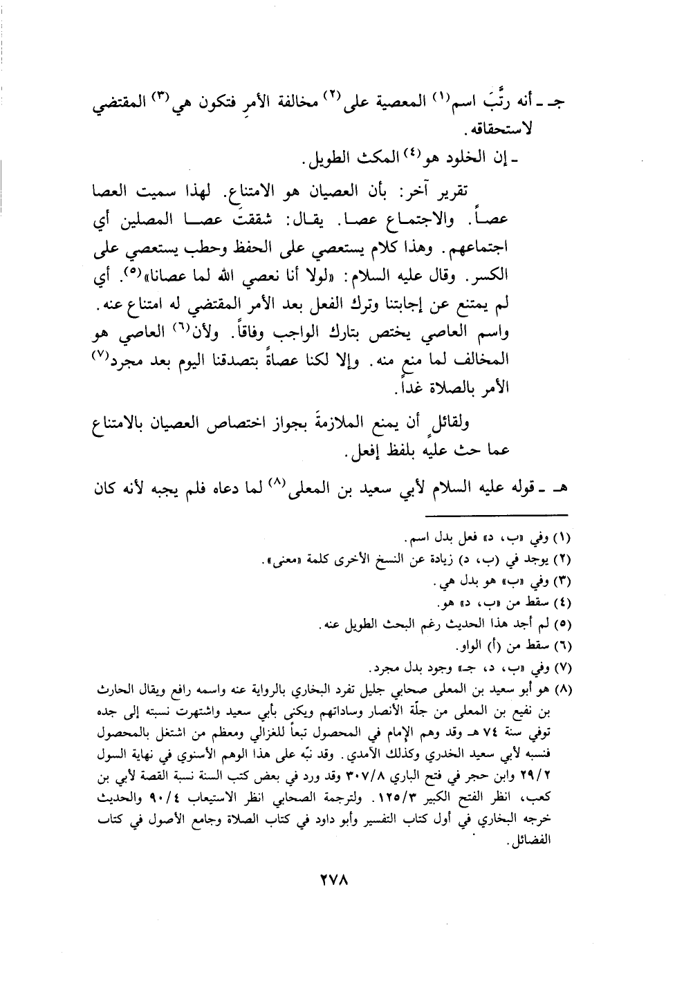 تقرير آخر: بأن العصيان هو الامتناعِ. لهذا سميت العصا عصًا. والاجتماع عصا. يقال: شققت عصا المصلين أي اجتماعهم. وهذا كلام يستعصي على الحفظ وحطب يستعصي على الكسر. وقال عليه السلام: "لولا أنا نعصي الله لما عصانا" (٥). أي لم يمتنع عن إجابتنا وترك الفعل بعد الأمر المقتضي له امتناع عنه.