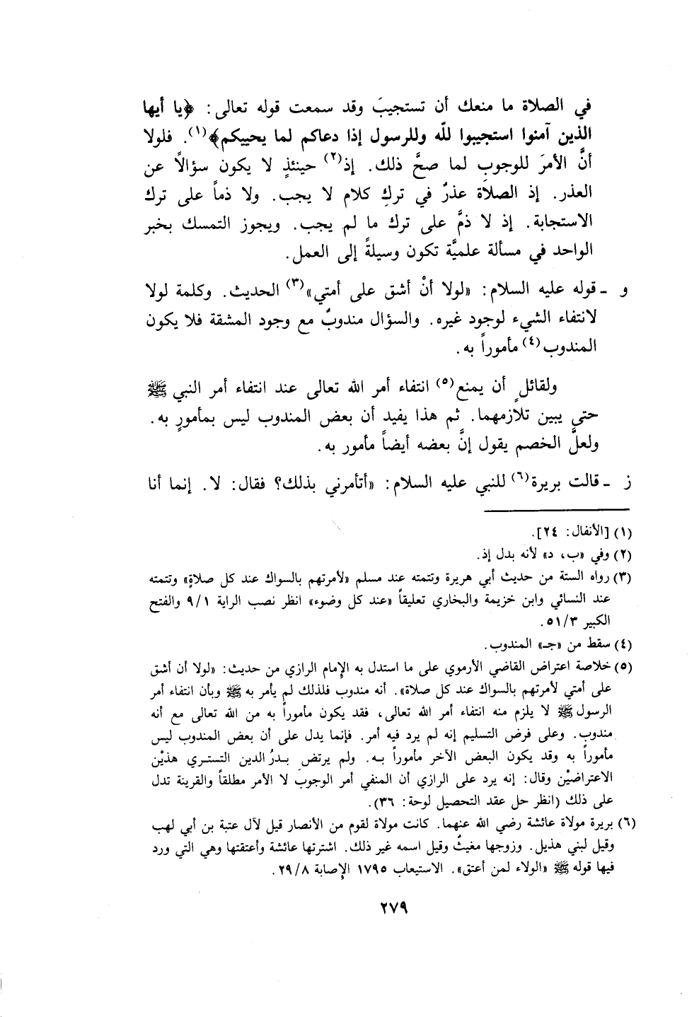 (٥) خلاصة اعتراض القاضي الأرموي على ما استدل به الِإمام الرَّازيّ من حديث: "لولا أن أشق على أمتي لأمرتهم بالسواك عند كل صلاة". أنَّه مندوب فلذلك لم يأمر به - صلى الله عليه وسلم - انتفاء أمر الرسول - صلى الله عليه وسلم - لا يلزم منه انتفاء أمر الله تعالى، فقد يكون مأمورًا به من الله تعالى مع أنَّه مندوب. وعلى فرض التسليم إنه لم يرد فيه أمر. فإنما يدل على أن بعض المندوب ليس مأمورًا به وقد يكون البعض الآخر مأمورًا به. ولم يرتضِ بدرُ الدين التستري هذيْن الاعتراضيْن وقال: إنه يرد على الرَّازيّ أن المنفي أمر الوجوب لا الأمر مطلقًا والقرينة تدل على ذلك (انظر حل عقد التحصيل لوحة: ٣٦).