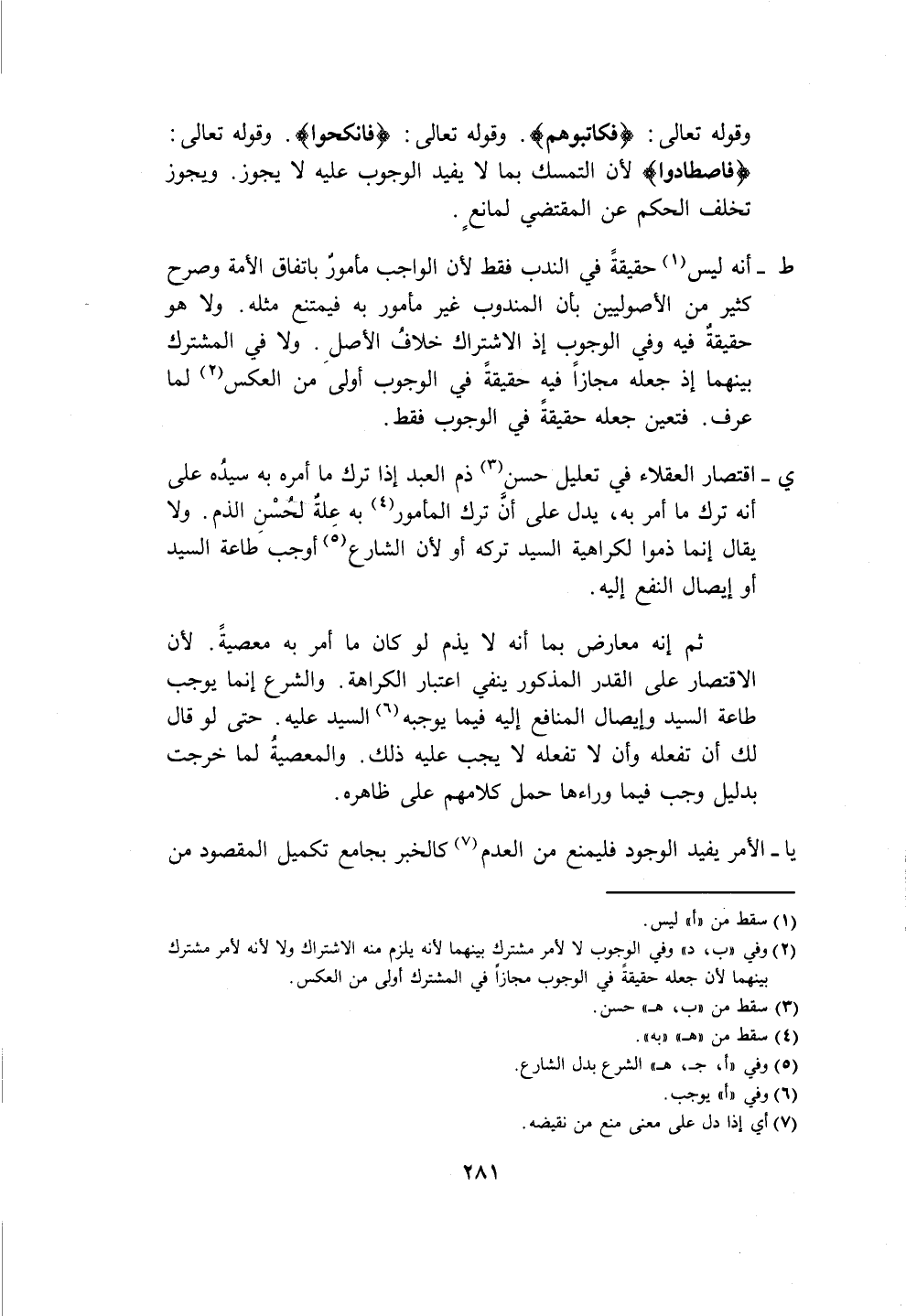 ي- اقتصار العقلاء في تعليل حسن (٣) ذم العبد إذا ترك ما أمره به سيدُه على أنَّه ترك ما أمر به، يدل على أنَّ ترك المأمور (٤) به عِلةٌ لحُسْن الذم. ولا يقال إنما ذموا لكراهية السيد تركه أو لأن الشارع (٥) أوجبَ طاعة السيد أو إيصال النفع إليه.
