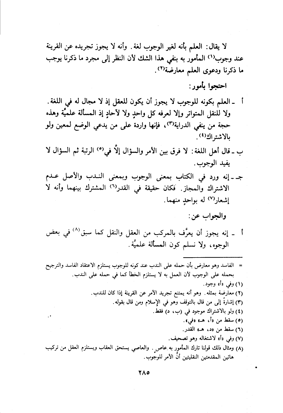 جـ - إنه ورد في الكتاب بمعنى الوجوب وبمعنى الندب والأصل عدم الاشتراك والمجاز. فكان حقيقة في القدر (٦) المشترك بينهما وأنه لا إشعار (٧) له بواحدٍ منهما.