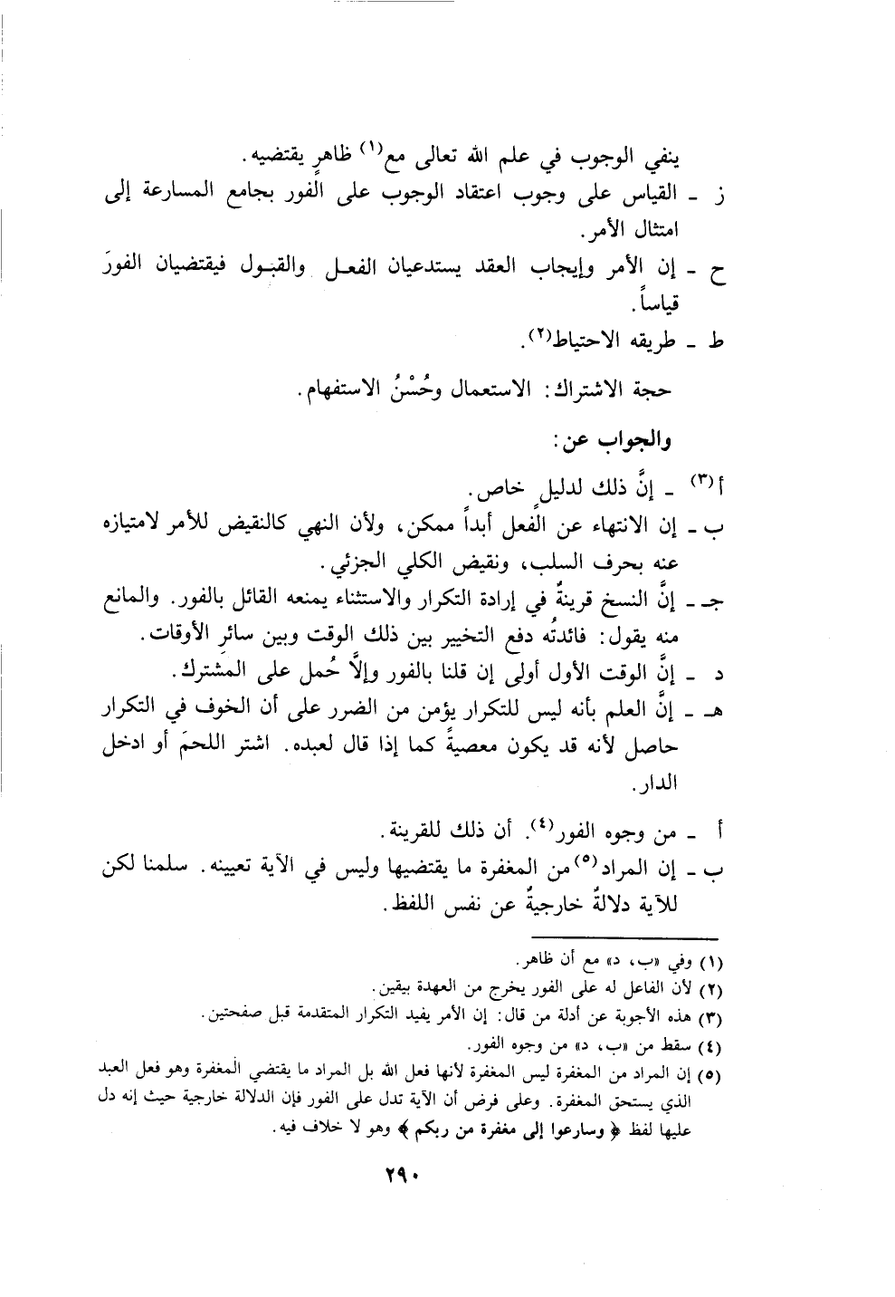 (٥) إن المراد من المغفرة ليس المغفرة لأنها فعل الله بل المراد ما يقتضي المغفرة وهو فعل العبد الذي يستحق المغفرة. وعلى فرض أن الآية تدل على الفور فإن الدلالة خارجية حيث إنه دل عليها لفظ {وَسَارِعُوا إِلَى مَغْفِرَةٍ مِنْ رَبِّكُمْ} وهو لا خلاف فيه.