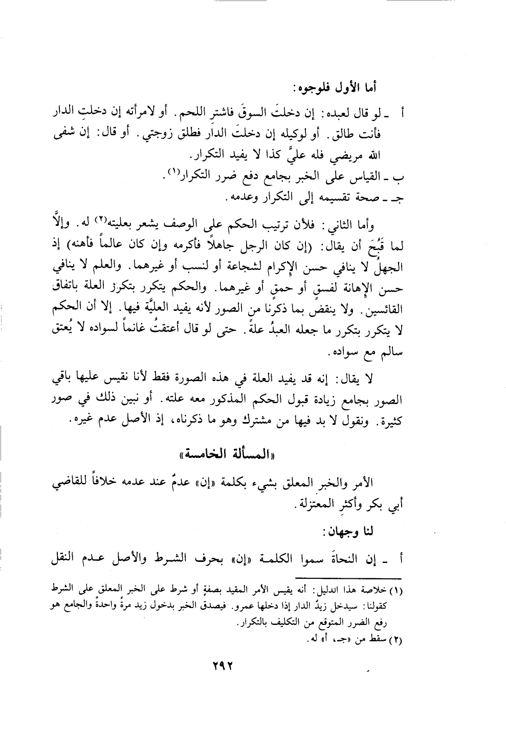(١) خلاصة هذا الدليل: أنَّه يقيس الأمر المقيد بصفةٍ أو شرط على الخبر المعلق على الشرط كقولنا: سيدخل زيد الدار إذا دخلها عمرو. فيصدق الخبر بدخول زيد مرةً واحدةً والجامع هو رفع الضرر المتوقع من التكليف بالتكرار.