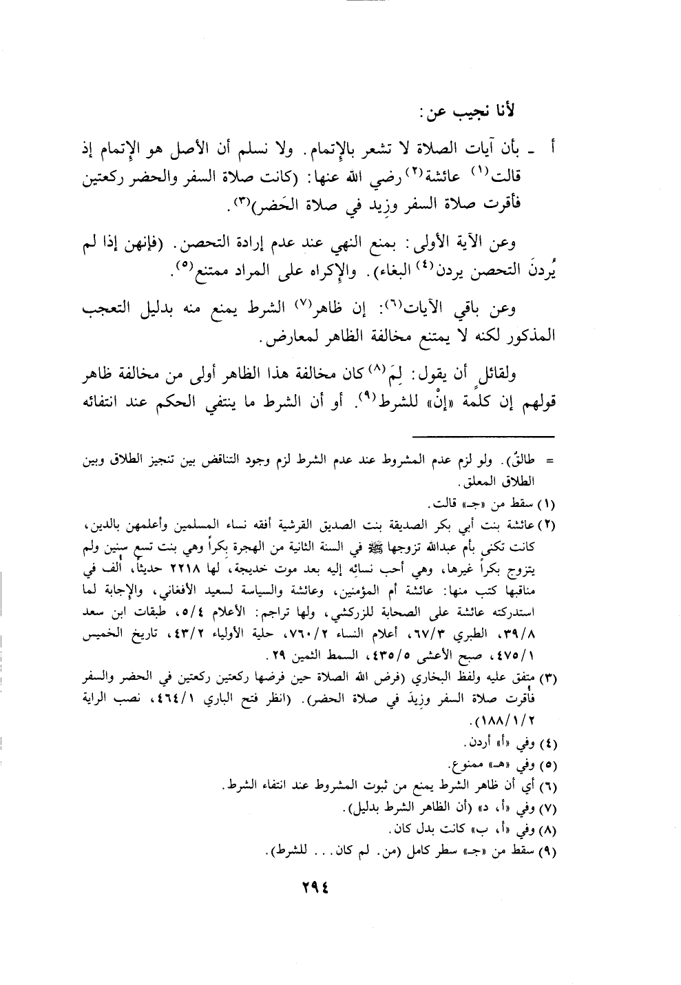 أ- بأن آيات الصلاة لا تشعر بالإتمام. ولا نسلم أن الأصل هو الإتمام إذ قالت (١) عائشة (٢) رضي الله عنها: (كانت صلاة السفر والحضر ركعتين فأقرت صلاة السفر وزِيد في صلاة الحَضر) (٣).
