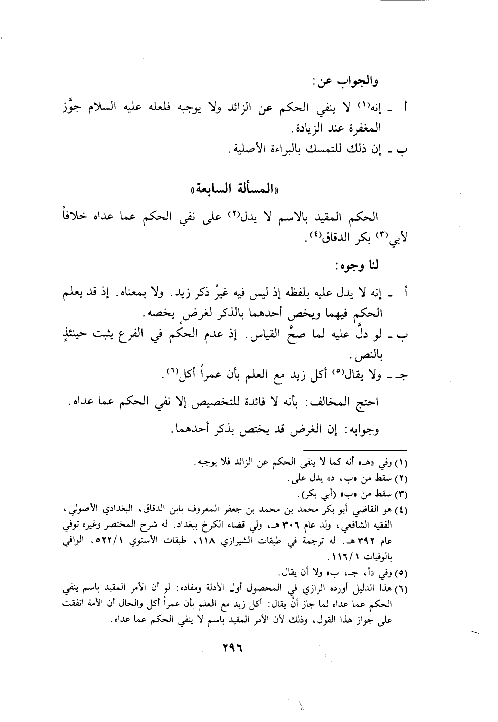 (٤) هو القاضي أبو بكر محمَّد بن محمَّد بن جعفر المعروف بابن الدقاق، البغدادي الأصولي، الفقيه الشَّافعيّ، ولد عام ٣٠٦ هـ، ولي قضاء الكرخ ببغداد. له شرح المختصر وغيره تُوفِّي عام ٣٩٢ هـ. له ترجمة في طبقات الشيرازي ١١٨، طبقات الإسنوي ١/ ٥٢٢، الوافي بالوفيات ١/ ١١٦.