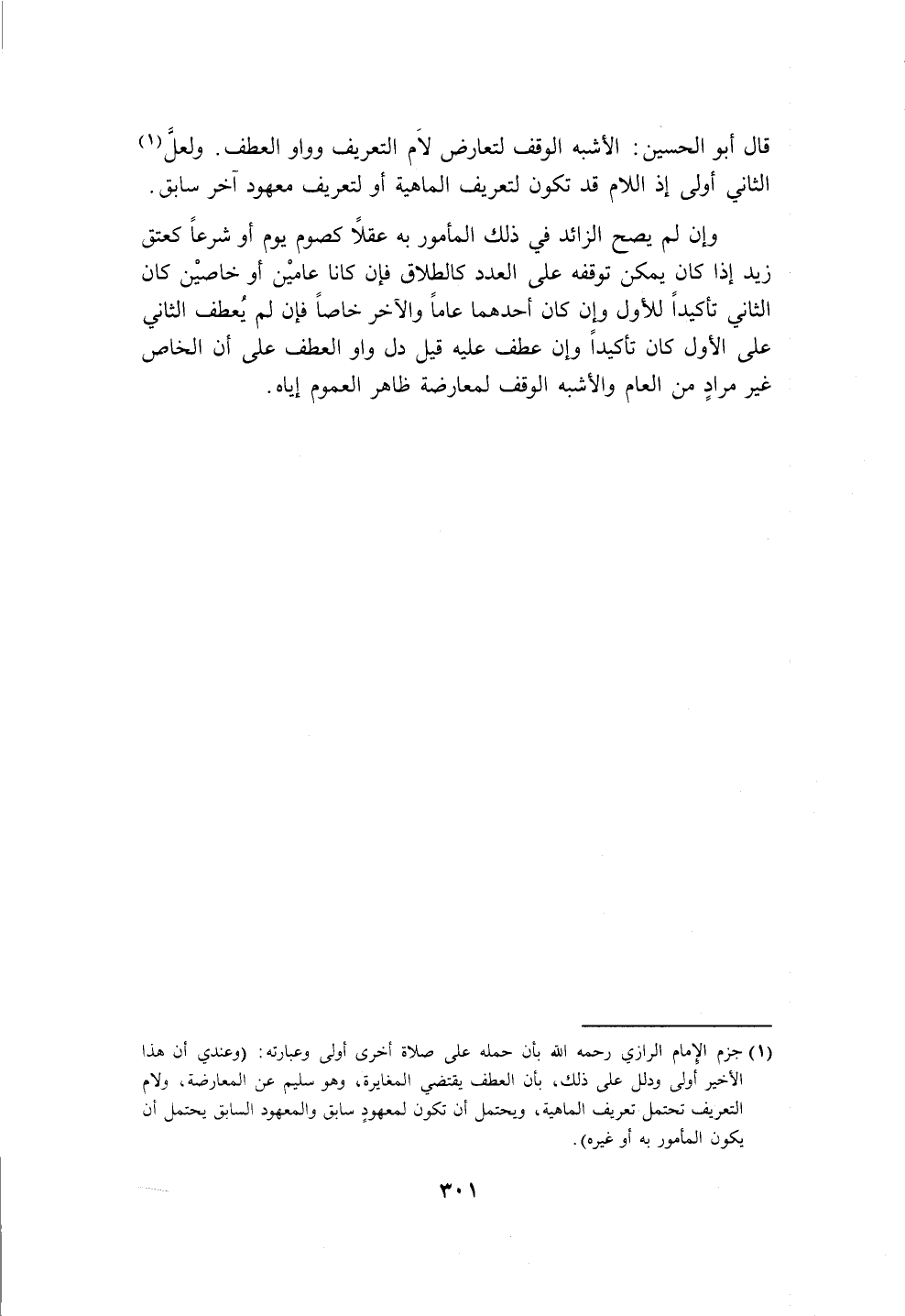 قال أبو الحسين: الأشبه الوقف لتعارض لَام التعريف وواو العطف. ولعلَّ (١) الثاني أولى إذ اللام قد تكون لتعريف الماهية أو لتعريف معهود آخر سابق.
