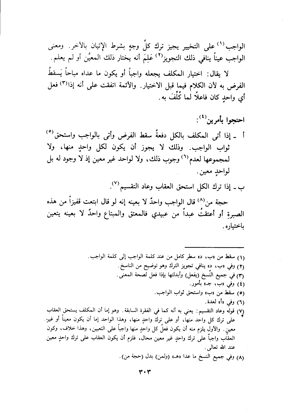 (٧) قوله وعاد التقسيم: يعني به أنَّه كما في الفقرة السابقة. وهو إما أن المكلف يستحق العقاب على ترك كل واحد منها، أو على ترك واحدٍ منها، وهذا الواحد إما أن يكون معينًا أو غير.