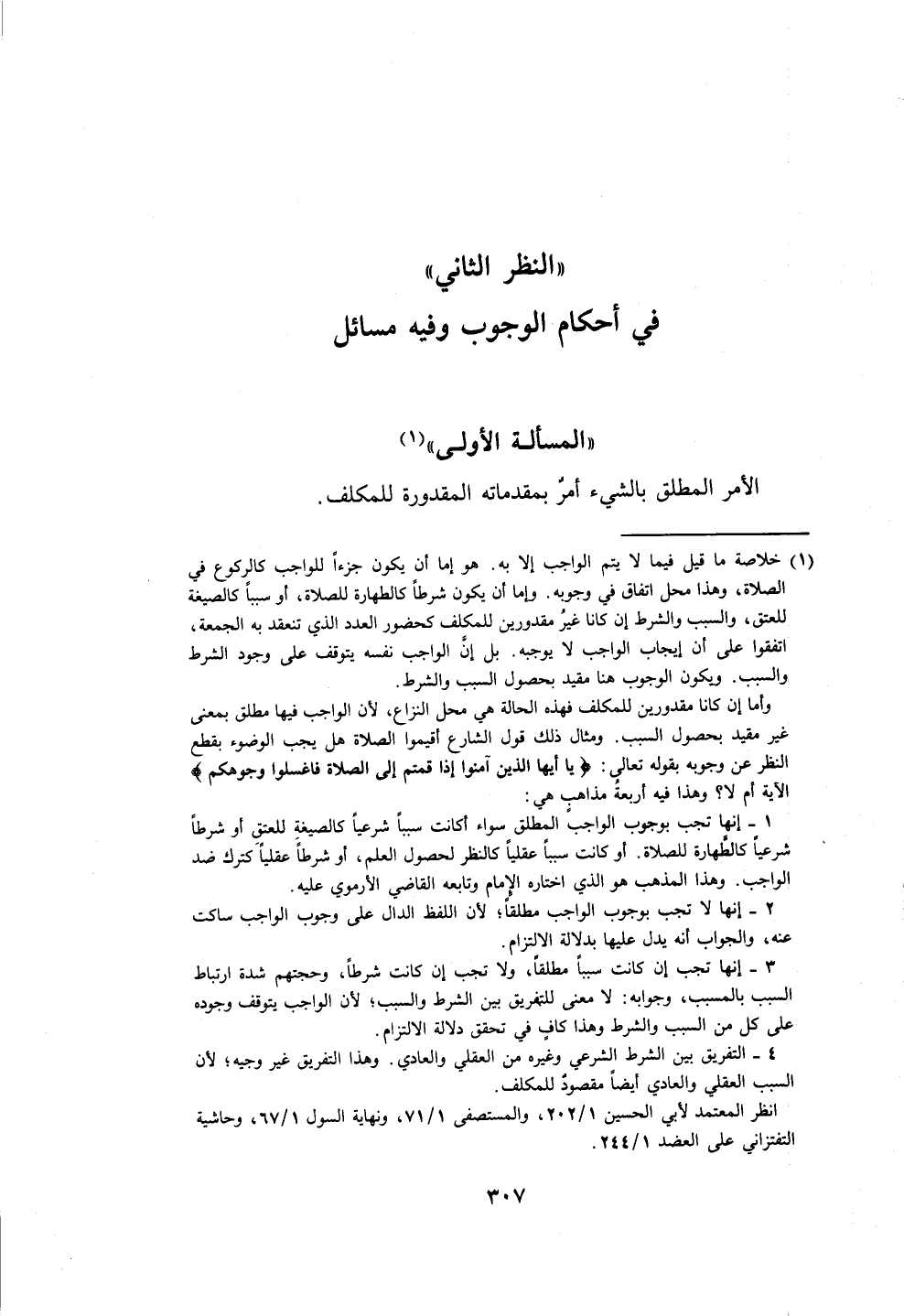 (١) خلاصة مما قيل فيما لا يتم الواجب إلَّا به. هو إما أن يكون جزءًا للواجب كالركوع في الصلاة، وهذا محل اتفاق في وجوبه. وإما أن يكون شرطًا كالطهارة للصلاة، أو سببًا كالصيغة للعتق، والسبب والشرط إن كانا غيرُ مقدورين للمكلف كحضور العدد الَّذي تنعقد به الجمعة، اتفقوا على أن إيجاب الواجب لا يوجبه. بل إن الواجب نفسه يتوقف على وجود الشرط والسبب. ويكون الوجوب هنا مقيد بحصول السبب والشرط.