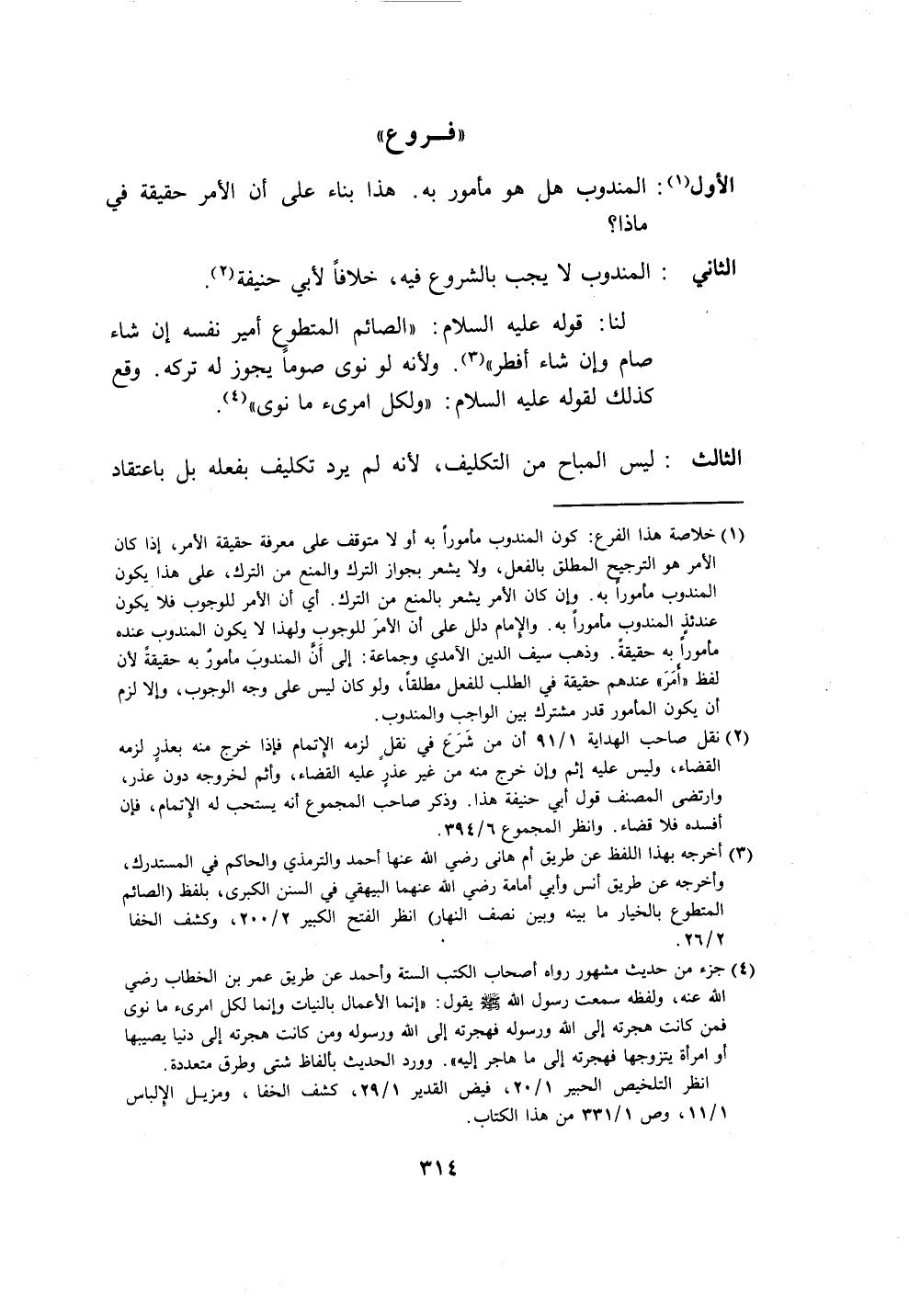 (١) خلاصة هذا الفرع: كون المندوب مأمورًا به أو لا موقف على معرفة حقيقة الأمر، إذا كان الأمر هو الترجيع المطلق بالفعل، ولا يشعر بجواز الترك والمنع من الترك، على هذا يكون المندوب مأموراً به. وإن كان الأمر يشعر بالمنع من الترك. أي أن الأمر للوجوب فلا يكون عندئذ المندوب مأمورًا به. والأمام دلل على أن الأمرَ للوجوب ولهذا لا يكون المندوب عنده مأمورًا به حقيقةً. وذهب سيف الدين الآمدي وجماعة: إلى أَن المندوبَ مأمورٌ به حقيقة لأن لفظ "أمَرَ" عندهم حقيقة في الطلب للفعل مطلقًا، ولو كان ليس على وجه الوجوب، وإلا لزم أن يكون المأمور قدر مشترك بين الواجب والمندوب.