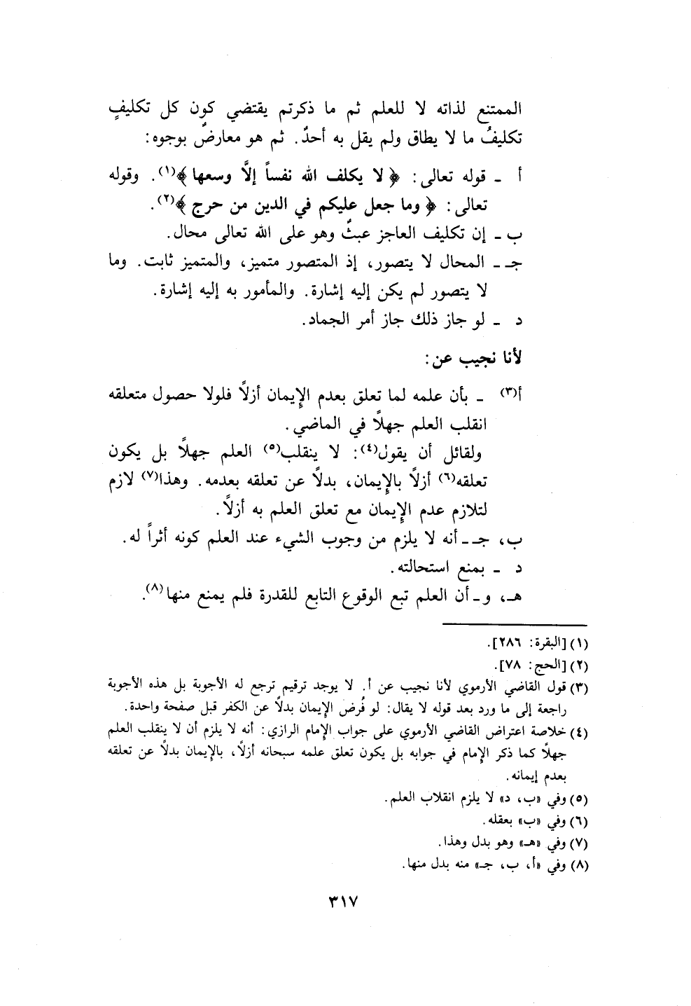 (٣) قول القاضي الأرموي لأنا نجيب عن أ. لا يوجد ترقيم ترجع له الأجوبة بل هذه الأجوبة راجعة إلى ما ورد بعد قوله لا يقال: لو فُرض الإِيمان بدلّا عن الكفر قبل صفحة واحدة.