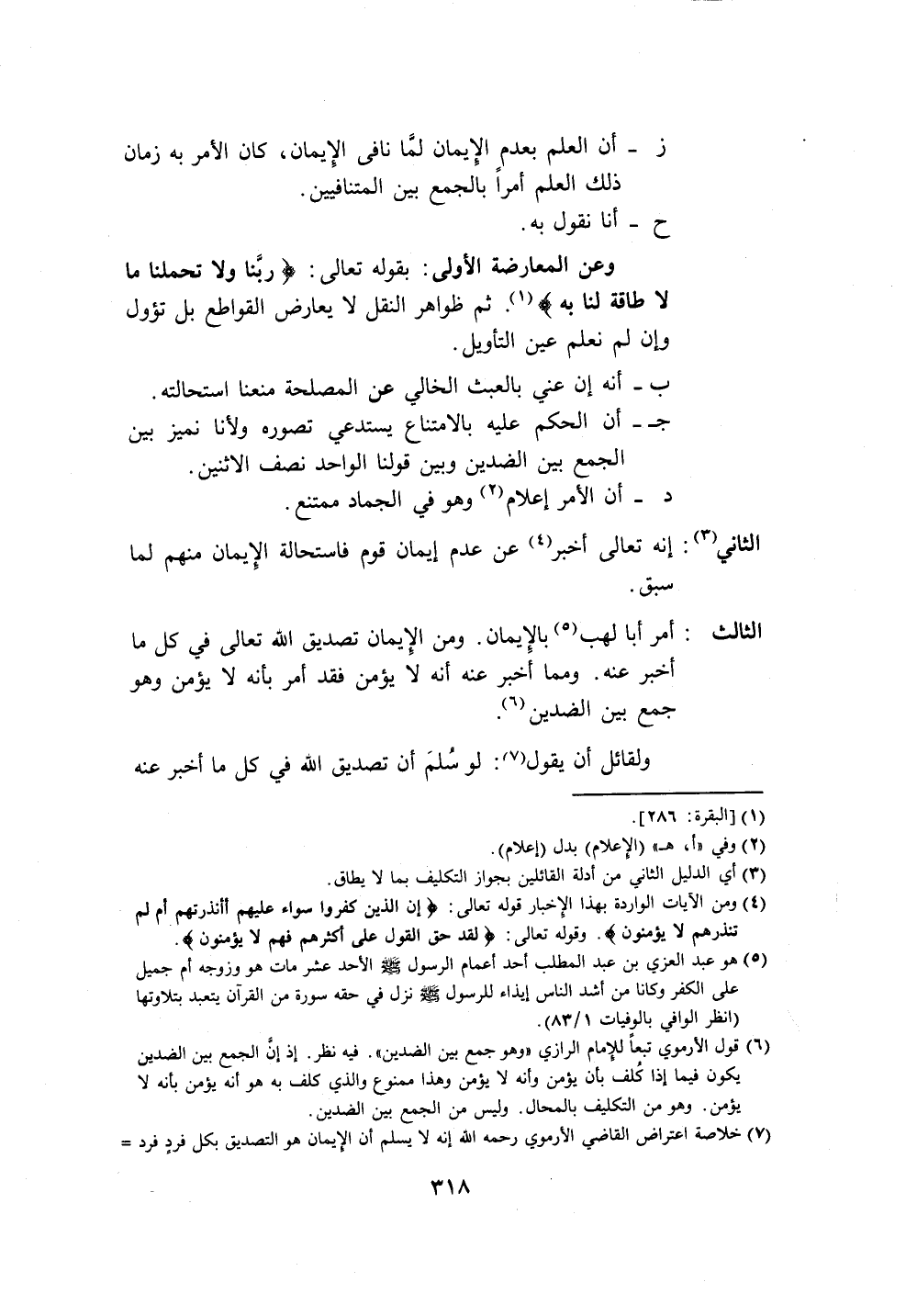 (٦) قول الأرموي تبعًا للإمام الرازي وهو جمع بين الضدين". فيه نظر. إذ إنِّ الجمع بين الضدين يكون فيما إذا كلف بأن يؤمن وأنه لا يؤمن وهذا ممنوع والذي كلف به هو أنَّه يؤمن بأنه لا يؤمن.