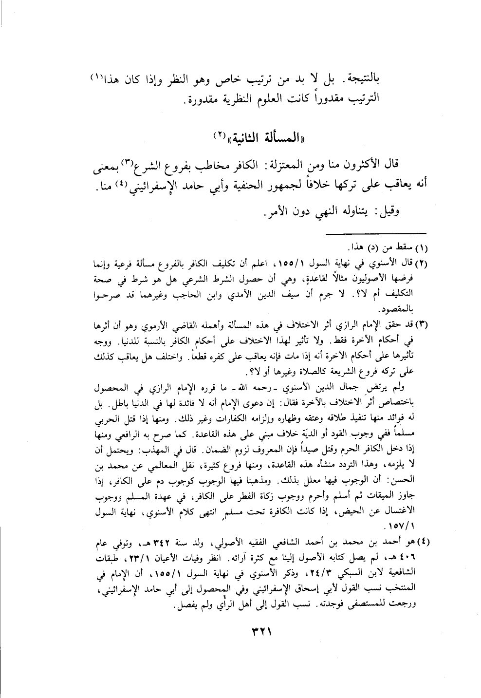 (٣) قد حقق الإِمام الرازي أثر الاختلاف في هذه المسألة وأهمله القاضي الأرموي وهو أن أثرها في أحكام الآخرة فقط. ولا تأثير لهذا الاختلاف على أحكام الكافر بالنسبة للدنيا. ووجه تأثيرها على أحكام الآخرة أنَّه إذا مات فإنه يعاقب على كفره قطعًا. وأختلف هل يعاقب كذلك على تركه فروع الشريعة كالصلاة وغيرها أو لا؟.